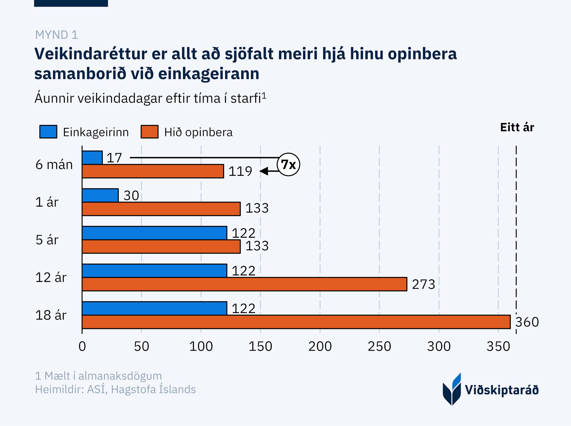 Veikindaréttur er mun ríkari hjá hinu opinbera en í einkageiranum (mynd 1). Eftir sex mánuði í starfi hefur opinber starfsmaður 119 daga í veikindarétt sem er sjöfaldur veikindaréttur miðað við einkageirann. Veikindaréttur opinberra starfsmanna eftir 6 mánuði er þá aðeins þremur dögum minni en veikindaréttur starfsmanna í einkageiranum eftir 5 ár í starfi. [1][2]
