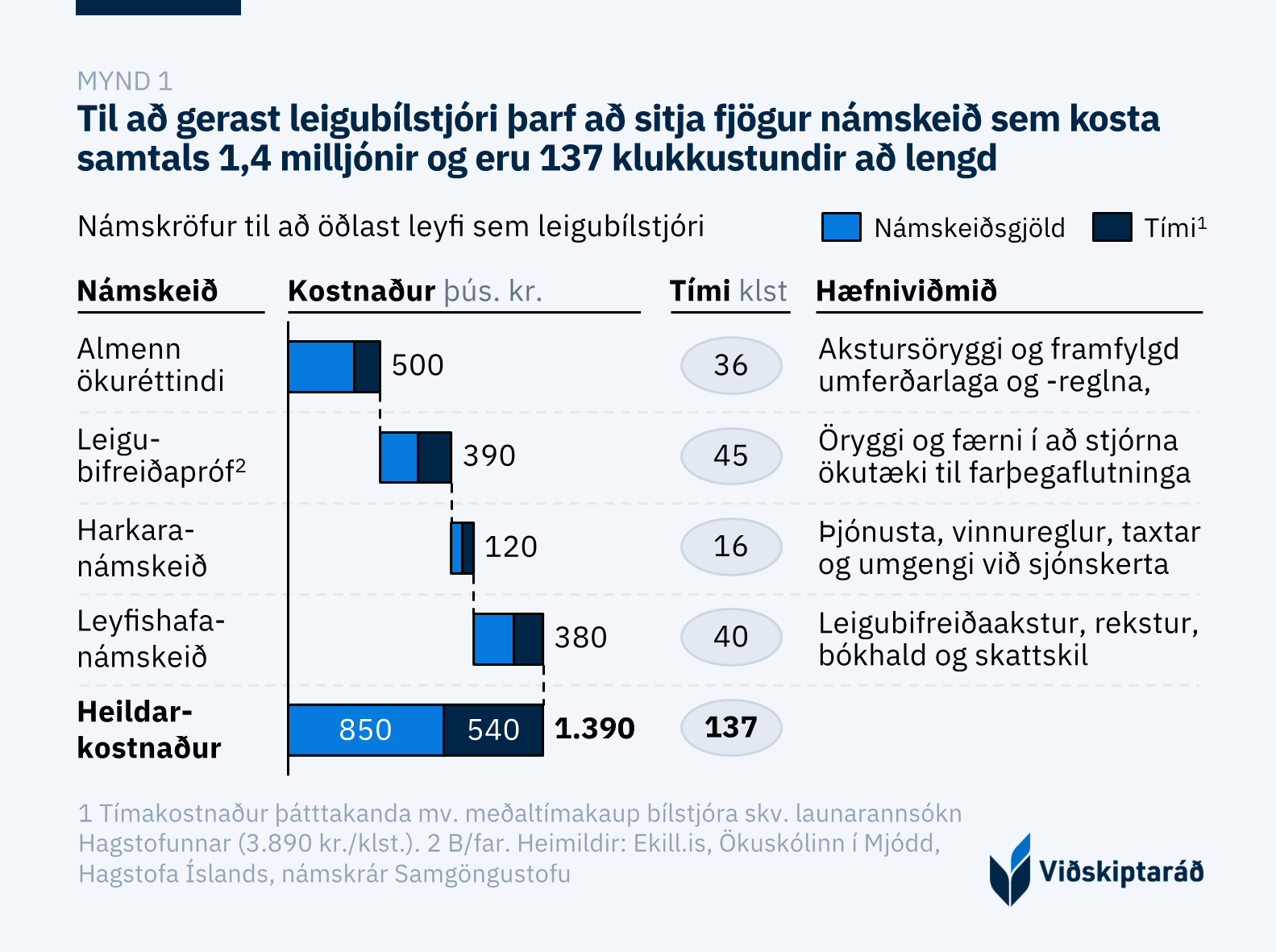 Gildandi námskeiðsfyrirkomulag fyrir leigubílstjóra er í senn of dýrt, óþarflega langt og snertir á ýmsum atriðum sem eru leigubílaakstri óviðkomandi. Til að verða fullgildur leigubílstjóri þarf einstaklingur að sitja fjögur áþekk námskeið, sem kosta 1,4 m. kr. og taka 137 klukkustundir samtals (mynd 1). Fyrir það fyrsta þarf sá sem hyggst nota eigin bifreið til leigubílaaksturs að hafa haft almenn ökuréttindi í hið minnsta þrjú ár. Ekki þarf að fara mörgum orðum um hæfniviðmið réttindanna en þau heimila einstaklingum að aka bifreið í umferðinni.