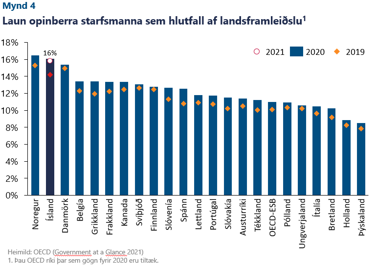 Launaþróun og fjölgun opinberra starfsmanna að undanförnu felur í sér verulega áskorun fyrir ríki og sveitarfélög. Laun opinberra starfsmanna sem hlutfall af stærð hagkerfisins í alþjóðlegu samhengi gefur enn skýrari mynd af stöðunni. Nýjustu gögn benda til þess að launakostnaður opinberra starfsmanna hafi verið 16% af landsframleiðslu árið 2020 samanborið við 11% meðaltal ESB ríkja í OECD. Aðeins í Noregi var hlutfallið lítillega hærra. Hátt hlutfall launakostnaðar ber merki þess að laun opinberra starfsmanna eða umsvif hins opinbera, líklega hvort tveggja í senn, séu mun hærri hér en víðast hvar annars staðar.