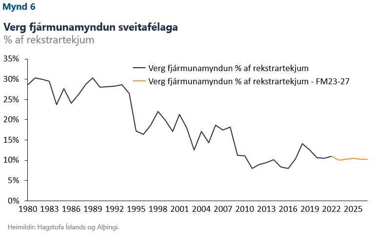 Í framlagðri fjármálaáætlun helst hlutfall fjárfestinga hins opinbera af VLF nokkuð stöðugt yfir tímabilið en merki eru um að fjárfestingar sveitarfélaga séu til þess fallnar að ýkja hagsveifluna fremur en að milda hana. Fjárfesting sveitarfélaganna sem hlutfall af rekstrartekjum var nokkurn veginn í sögulegu lágmarki í heimsfaraldrinum og lækkaði verulega frá 2018. Sveitarfélög þurfa að standa við lögbundna þjónustu við íbúa, sem krefst m.a. fjárfestingar og viðhalds innviða sem eru á ábyrgð sveitarfélaga. Fjárfesting sveitarfélaga, eins og ríkisins, getur gegnt sveiflujafnandi hlutverki og í uppsveiflu eins og nú þarf að gæta að því að hún auki ekki á spennuna í hagkerfinu. Með því er ekki sagt að sveitarfélög eigi að draga alfarið úr fjárfestingu heldur þurfa þau að forgangsraða í þágu nauðsynlegra verkefna og í takt við þróun efnahagsmála.