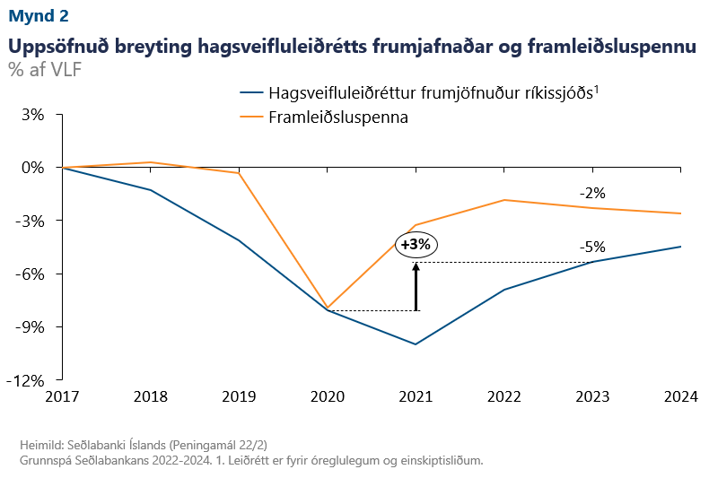 Það er deginum ljósara að hagkerfið kemur mun betur undan faraldrinum en flestir spáðu og þorðu að vona en til að mynda gefa hagtölur, framlögð fjármálastefna og afkoma ríkissjóðs slíkt til kynna. Þrátt fyrir að bæði ríki og sveitarfélög muni koma til með að draga úr hallarekstri sínum á næstu árum er ekkiunnt að tala um aðhald ríkisfjármála í þeim skilningi að stigið verði á bremsuna. Rammasett útgjöld eru aukin um 2,2% á föstu verðlagi milli gildandi fjárlaga 2022 og ársins 2023 og er„aðhaldið“í ríkjandi hallarekstri til þess fallið að þenja hagkerfið þó svo áhrifin fari dvínandi.Merkja má þensluáhrifinskilmerkilega á mælikvarða hagsveifluleiðrétts frumjafnaðar (mynd 2) en þar má sjá að slaki í ríkisfjármálum verður enn töluverður árið 2023.Þessi mikli slaki á ríkisfjármálum sést líka í því að framleiðsluspennan á næsta ári, þ.e. hversu mikið hagkerfið framleiðir í hlutfalli við undirliggjandi framleiðslugetu, verður ekki langt frá þeirri spennu sem ríkti árið 2017, eða -2%. Á sama tíma verður uppsöfnuð breyting hagsveifluleiðrétts frumjafnaðarfrá árinu 2017neikvæð um5% af VLF. Hér er einnig rétt að nefna að aukinn halli þýðir auknar skuldir sem kallar á hærri vaxtagjöld en þau verða 76 ma.kr. á næsta ári og fara hækkandi á tímabilinu.