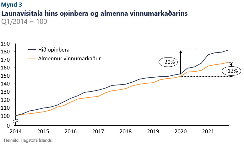 Á sama tíma og hið opinbera hefur leitt launahækkanir hefur opinberum starfsmönnum fjölgað töluvert. Frá árinu 2019 hefur starfandi hjá hinu opinbera fjölgað um 7,6% en starfandi einstaklingum á almennum vinnumarkaði fækkaði um 7,1%.