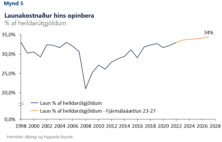 Þar að auki er fyrirséð að launakostnaður hins opinbera af heildarútgjöldum þess mun vaxa enn frekar á næstu árum og ná sögulegu hámarki undir lok tímabilsins. Það liggur því í augum uppi að hið opinbera mun leika lykilhlutverk í kjarasamningum í haust en það er bæði gömul saga og ný að hækkun nafnlauna umfram það svigrúm sem er til staðar á hverjum tíma getur hæglega leitt til víxlverkunar launa og verðlags. Þannig yrði engum greiði gerður en slíkt myndi auka vaxtabyrði heimilanna enn frekar.