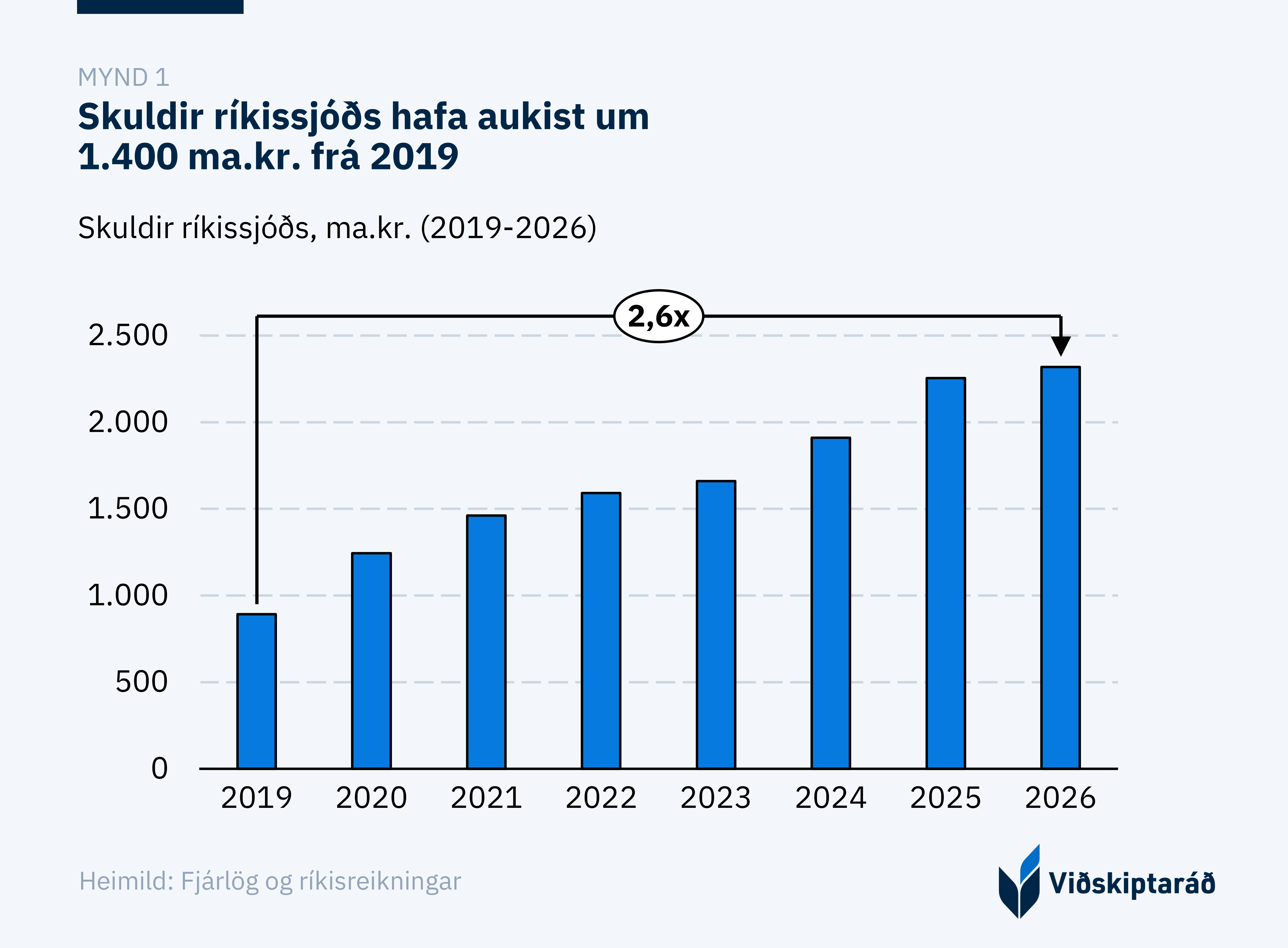 Skuldasöfnun undanfarinna ára er ekki aðeins afleiðing af viðvarandi hallarekstri, heldur einnig þeirri staðreynd að hreinn lánsfjárjöfnuður ríkissjóðs hefur verið neikvæður allt frá 2019.[1] Frá árinu 2019 hafa skuldir aukist um rúma 1.400 ma.kr., úr 890 ma.kr. í 2.320 ma.kr. Skuldir ríkissjóðs munu þannig tæplega þrefaldast á átta árum miðað við forsendur fjárlagafrumvarpsins (mynd 1).