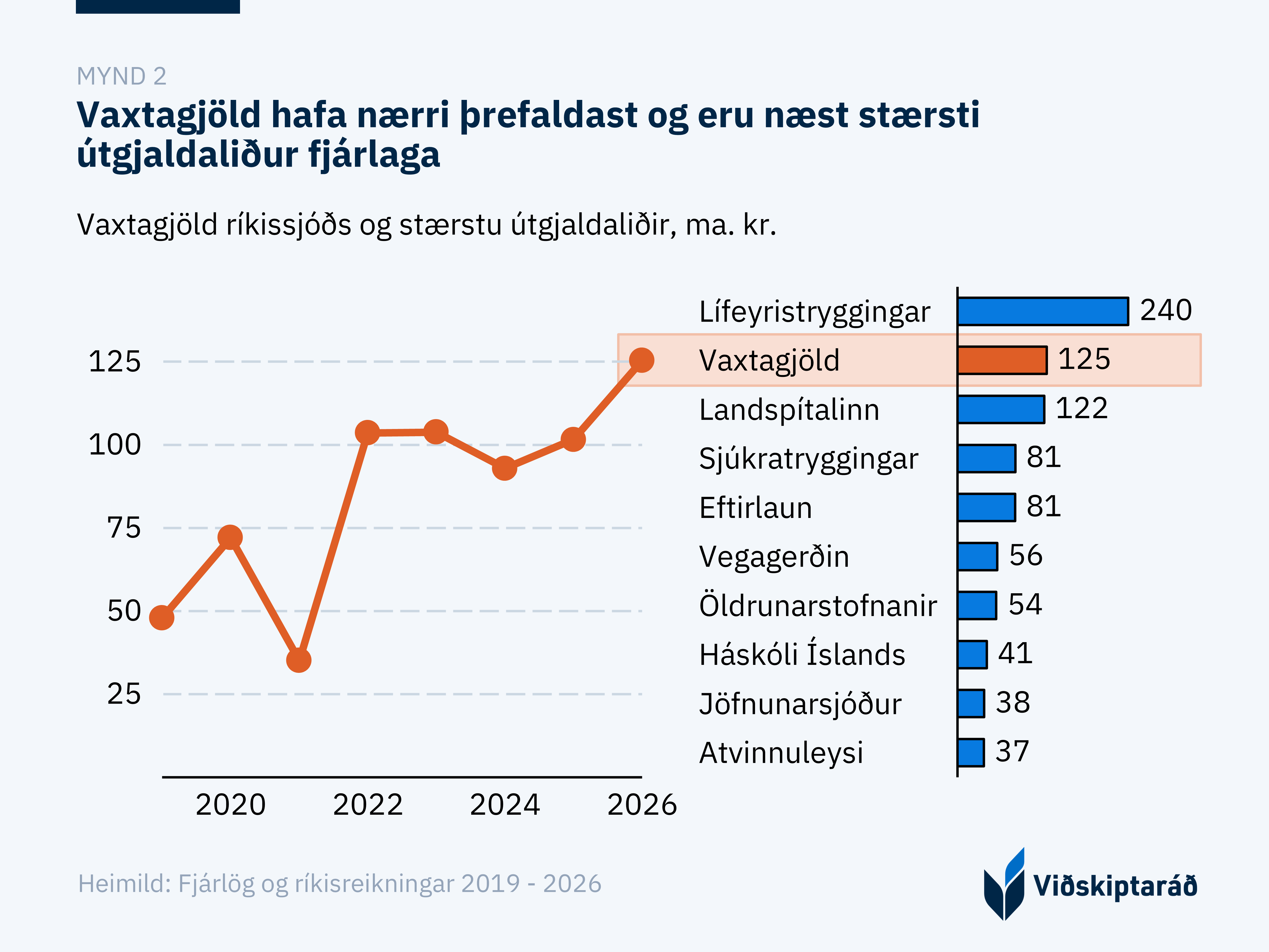 Afleiðing skuldasöfnunar undanfarinna ára er sú að vaxtagjöld eru orðinn næst stærsti útgjaldaliðurinn í fjárlagafrumvarpi ársins 2026 (mynd 2). Frá árinu 2019 hafa vaxtagjöld hækkað úr 47 ma.kr. árið 2019 í 125 ma.kr. árið 2026. Þá eru vaxtagreiðslur af skuldum ríkissjóðs orðnar kostnaðarsamari en rekstur Landsspítalans, Háskóla Íslands og Vegagerðarinnar.