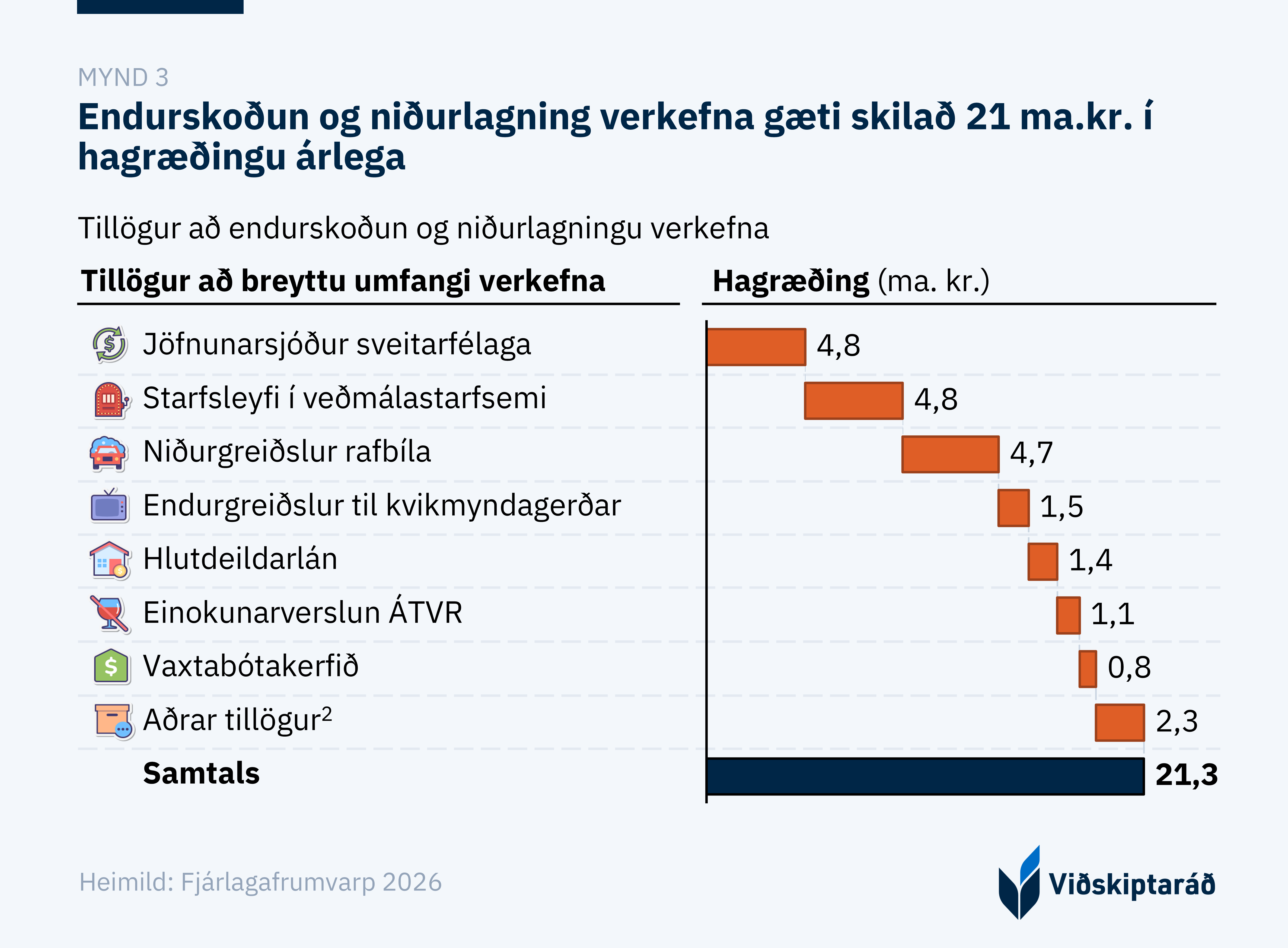 #1 Niðurlagning og endurskoðun verkefna: Viðskiptaráð leggur fram 13 tillögur um verkefni sem ríkið getur lagt af eða endurskoðað með það fyrir augum að hagræða verulega (mynd 3).