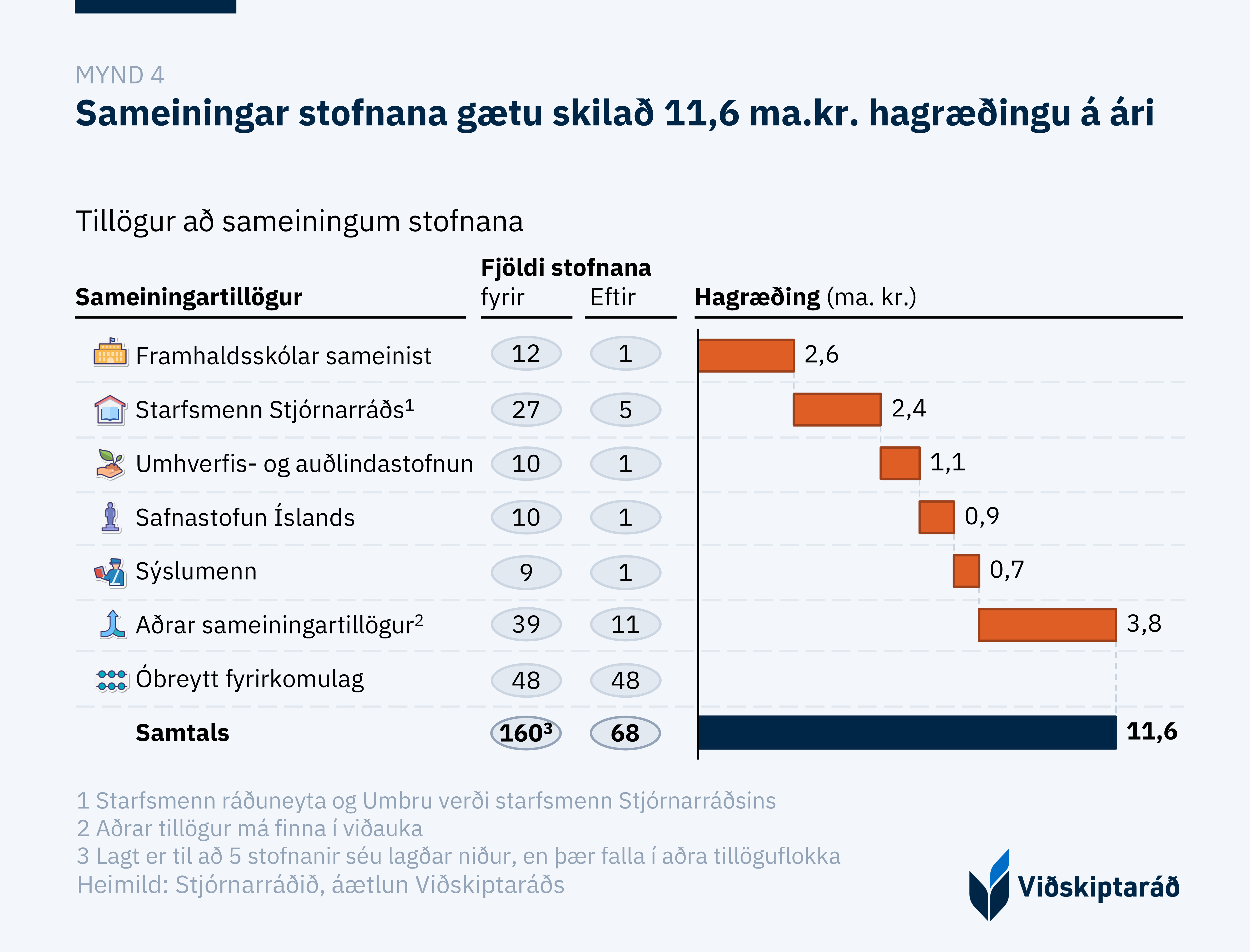 Í ljósi smæðar Íslands mun hlutfallslegur kostnaður af rekstri stofnanakerfis vera hærri en í fjölmennari ríkjum. Þó eru víða tækifæri til að gera betur og fækka stofnunum með sameiningum, þannig að eftir standi færri stærri stofnanir, sem verja hærra hlutfalli útgjalda í sína kjarnastarfsemi. Sameiningarnar myndu þannig lækka hlutfallslegan kostnað við rekstur stofnanakerfisins, en á sama tíma tryggja betri nýtingu skattfjár og auka gæði opinberrar þjónustu.