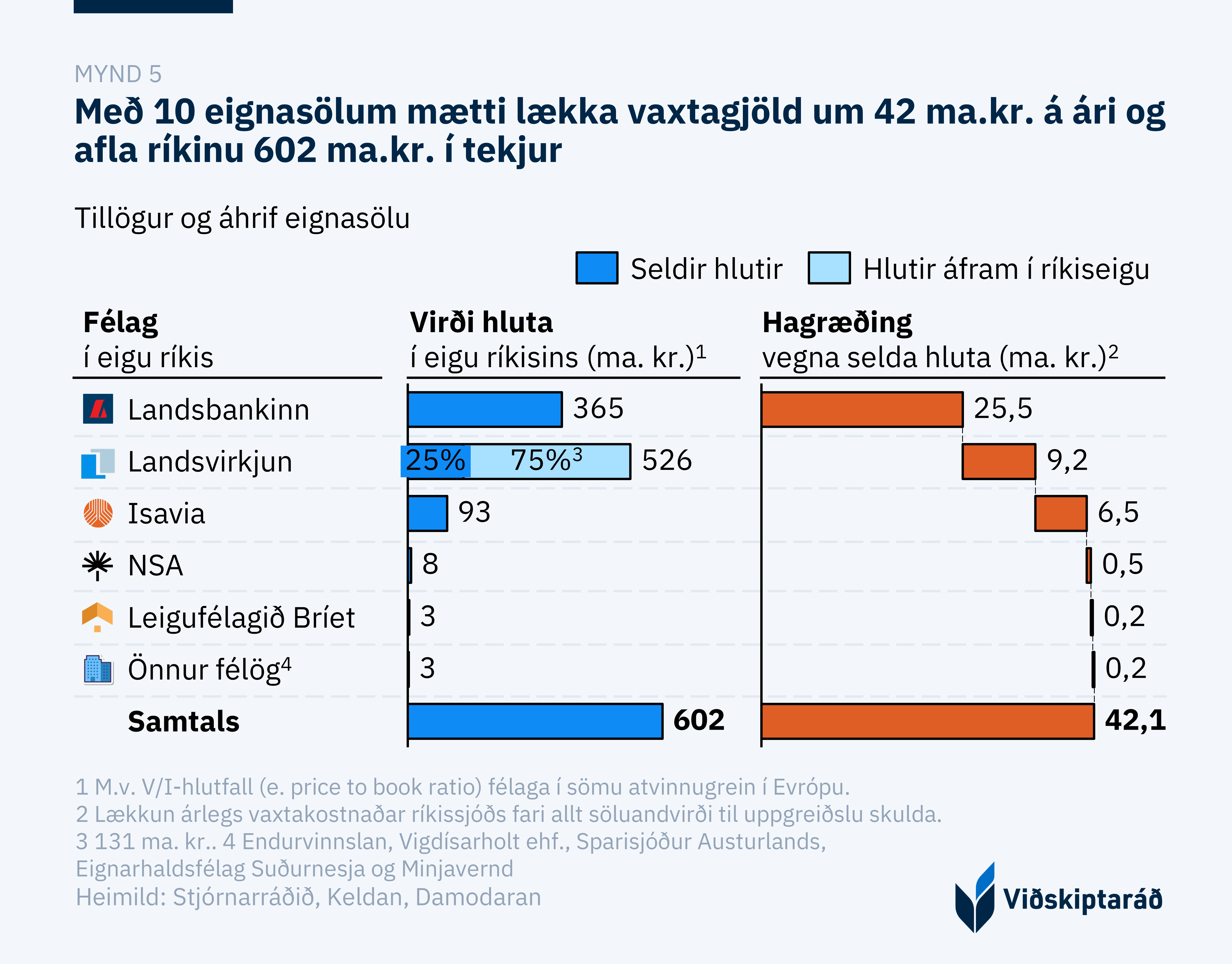 #3 Eignasala: Viðskiptaráð leggur til að hlutur ríkisins í 10 félögum að andvirði 602 ma. kr. verði seldur (mynd 5). Þá telur Viðskiptaráð það mikil vonbrigði að aðeins sé áætluð eignasala á komandi ári upp á 800 m.kr. á virði eignarhluta ríkisins í ýmsum fyrirtækjum er virði mörg hundruð milljarða króna.