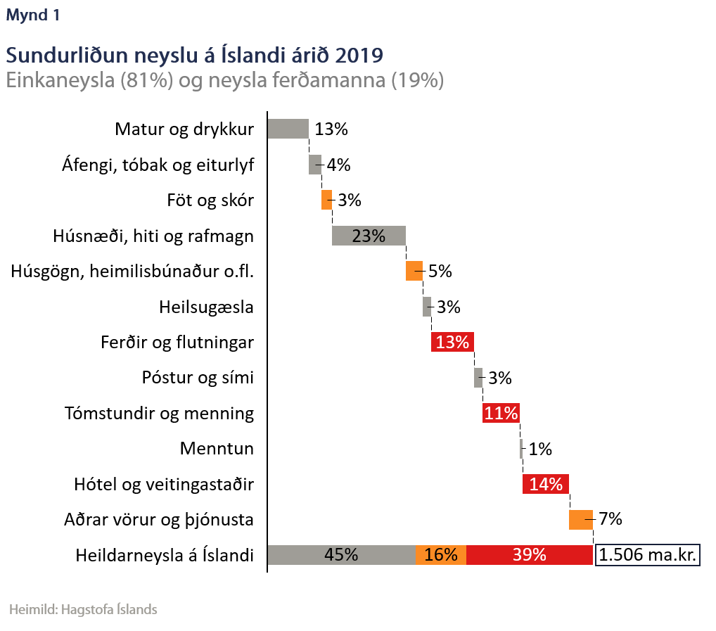 Þó að Ísland standi að mörgu leyti vel og allar forsendur séu fyrir því að komast í gegnum þetta efnahagsáfall standandi er útlitið mjög dökkt til skemmri tíma. Til að glöggva sig á því má horfa á undirliði neyslu heimamanna og ferðamanna hér á landi (mynd 1). Litla yfirlegu þarf til að átta sig á því að COVID-19 gæti haft áhrif á nær alla neysluliði. Líklegt er að neysla sumra vara og þjónustu, t.d. fatnaðar og heimilisbúnaðar, falli verulega á tímum óvissu og samkomubanns. Slíkt blasir við nú þegar verslanir keppast við að loka í óákveðinn tíma. Þar að auki eru stórir liðir (rauðmerktir) sem verða fyrir enn hraðari og beinni áhrifum einkum vegna umfangs ferðaþjónustu og beinum áhrifum samkomubanns, t.d. hótel og veitingarekstur og allt sem snýr að ferðum og flutningum. Samtals stendur slík starfsemi undir 39% af allri neyslu en er núna stopp eða í lamasessi. Þegar þetta er skrifað eru flugsamgöngur til landsins í mýflugumynd og hefur 78% brottfara frá Keflavíkurflugvelli í dag, 24. mars, verið aflýst og útlit er fyrir að draga muni úr flugi áfram næstu dag. Í þessum vangaveltum eru ótalin áhrif röskunar á öðrum útflutningi og verðlækkanir á mörkuðum auk þess sem allar líkur eru á að fjárfesting verði minni en áður var áætlað.