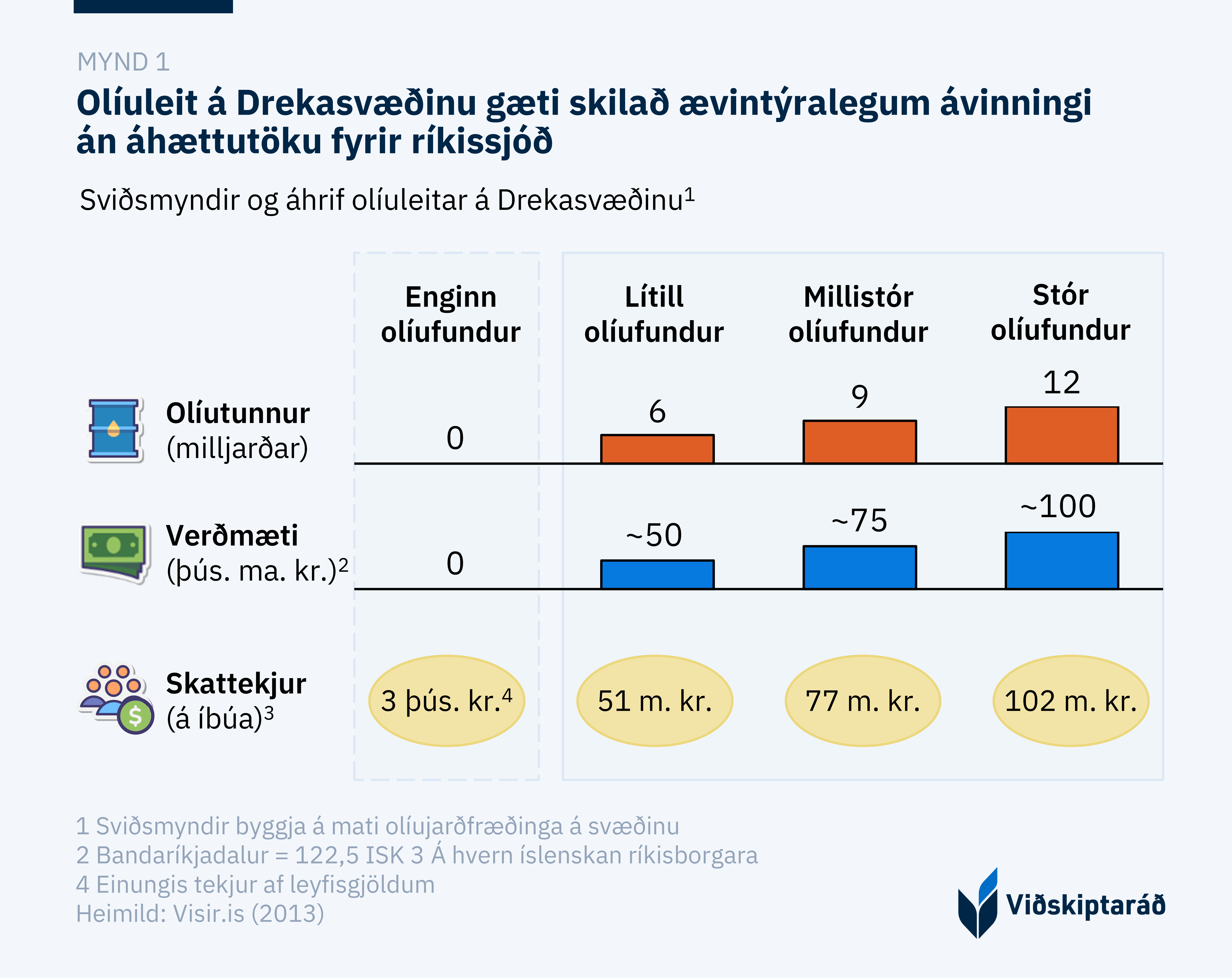 Nýleg úttekt Viðskiptaráðs á ávinningi af olíuleit á Drekasvæðinu sýnir að mögulegar skatttekjur af olíulindum á svæðinu gætu numið 51 til 102 m. kr. á hvern íslenskan ríkisborgara (mynd 1). Óháð því hvort að olía finnst í vinnanlegu magni mun leitin skila ríkissjóði tekjum í formi leyfisgjalda sérleyfishafa.[1]