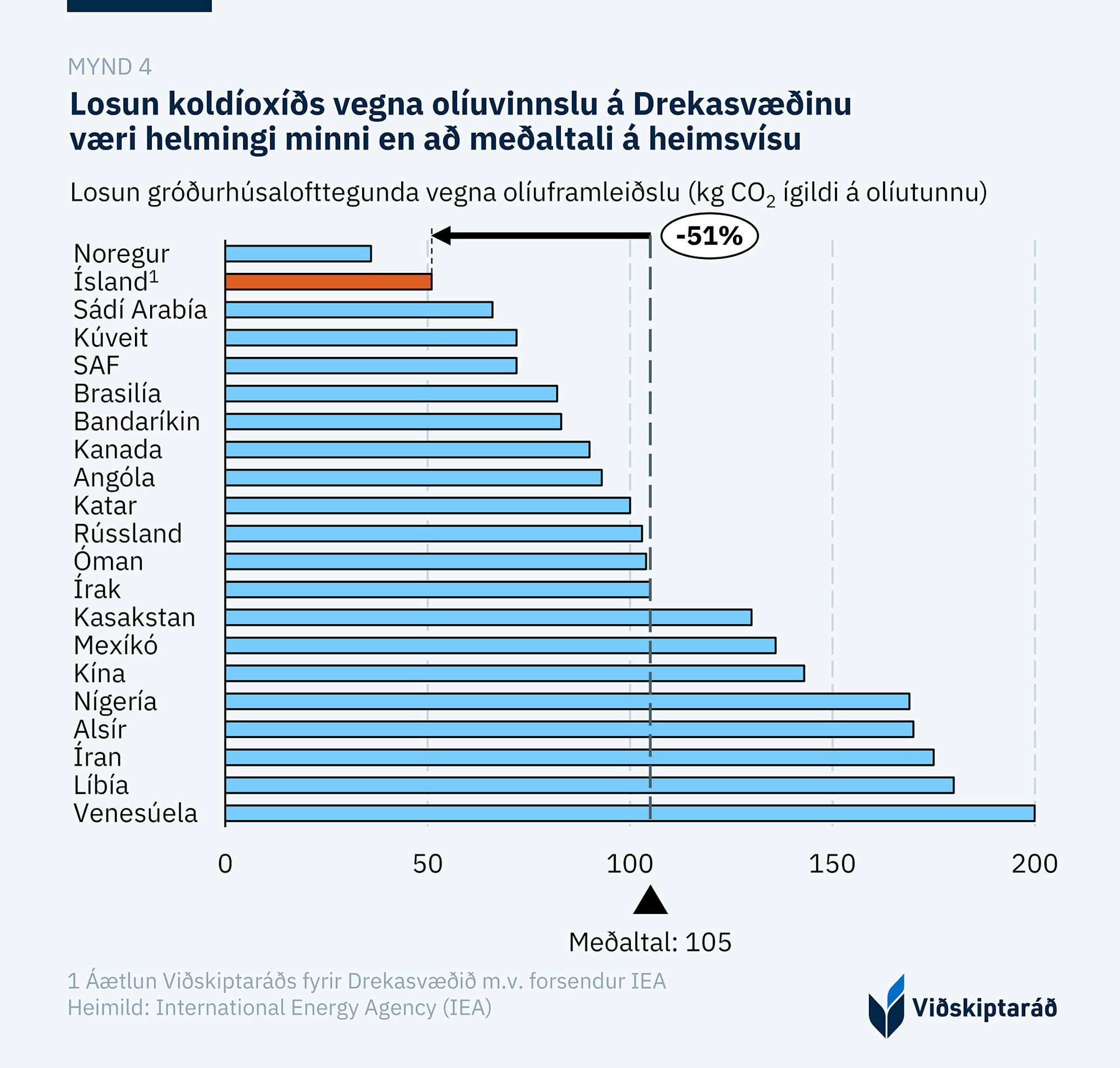 Áhyggjur hafa verið uppi um væntanleg neikvæð umhverfisáhrif af olíuleit og -vinnslu, en í því samhengi skoðaði Viðskiptaráð umhverfisáhrifin. Áætla má að olíuframleiðsla á Drekasvæðinu yrði ein sú umhverfisvænasta í heiminum m.t.t. losunar CO2 (mynd 4). Á heimsvísu er losun CO2 vegna olíuvinnslu afar misjöfn eftir aðstæðum og vinnsluaðferðum. Þar sem losunin er minnst, í Noregi, er hún um fimmfalt lægri en þar sem hún er mest, í Venesúela.