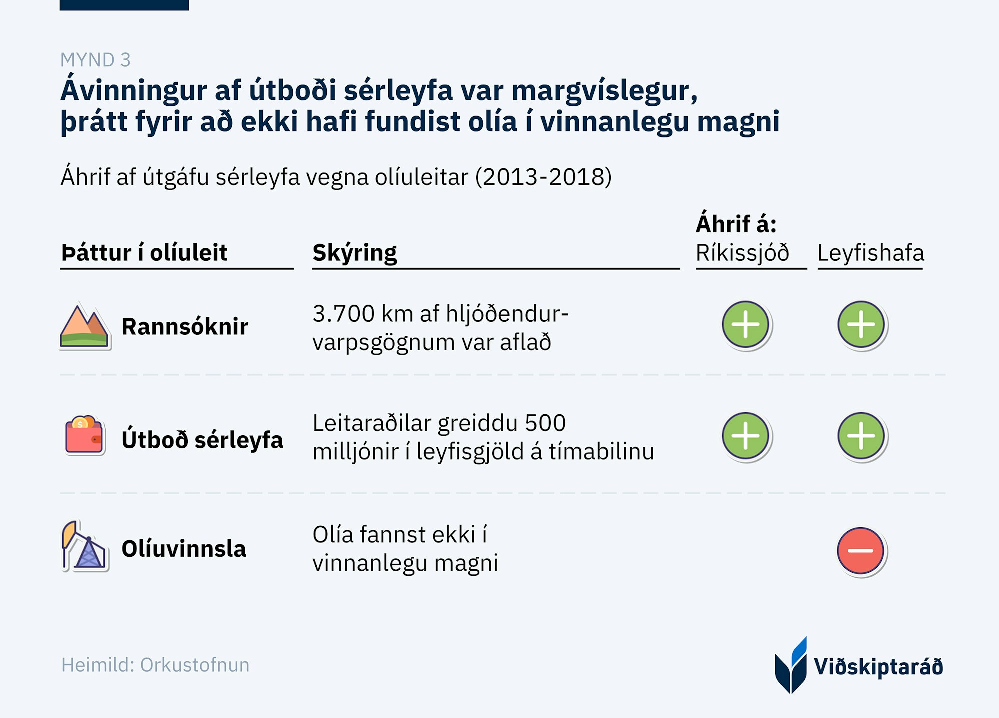 Þegar horft er til síðasta útboðs og útgáfu sérleyfa er ljóst að ávinningurinnn af henni var margvíslegur þrátt fyrir að ekki hafi fundist olía í vinnanlegu magni. Útgáfan var sérlega ábatasöm fyrir ríkið þar sem sérleyfishafarnir greiddu 500 m.kr. í sérleyfisgjöld á tímabilinu, auk þess að gögnin sem aflað var við leitina eru í eigu stjórnvalda (mynd 3).