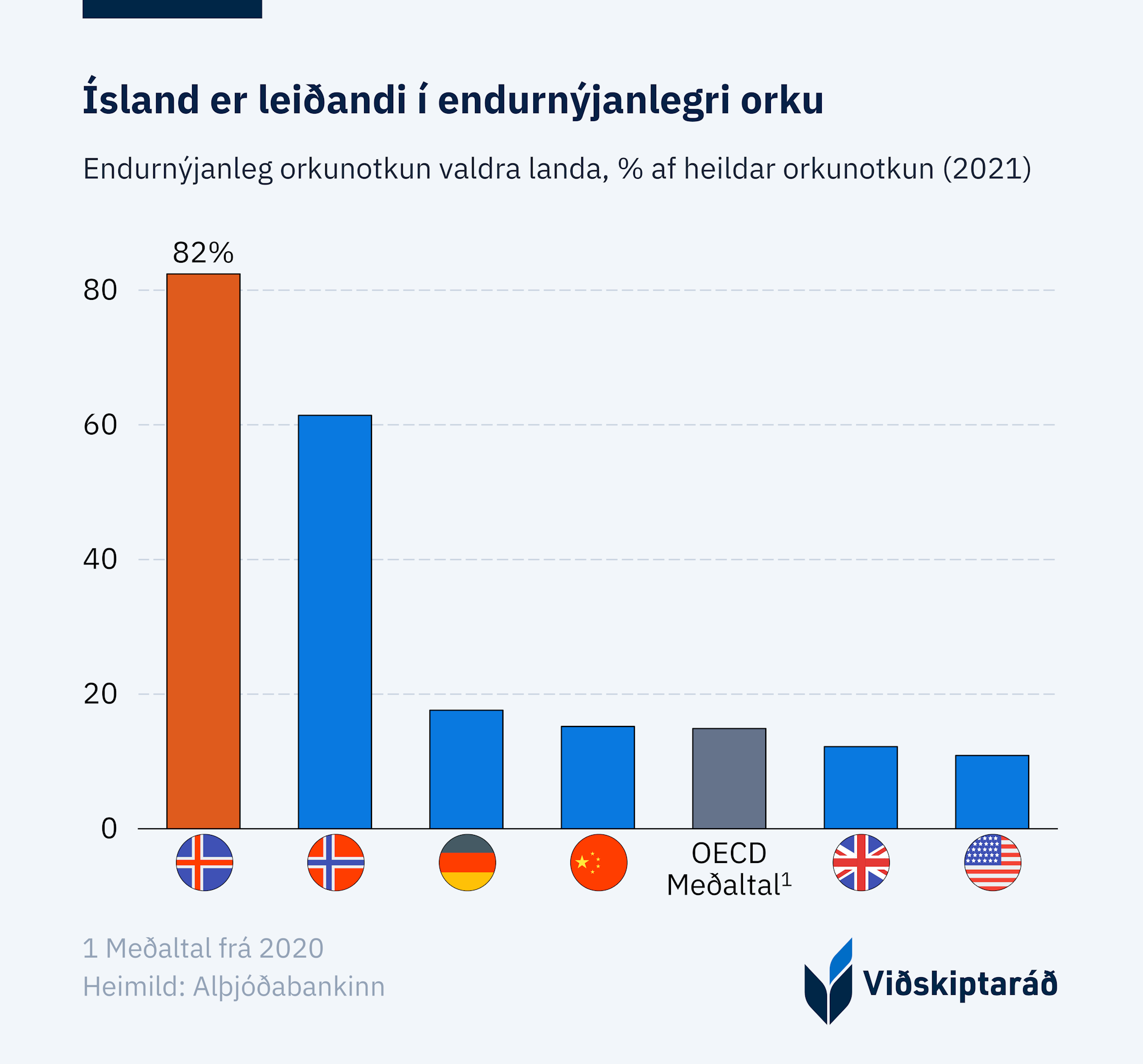 Ísland hefur einstaka stöðu í alþjóðlegu samhengi. Hlutfall endurnýjanlegrar orku hér á landi er með því hæsta sem þekkist í heiminum (sjá mynd). Þá er losun á hverja framleiðslueiningu lág í alþjóðlegum samanburði og þjóðin er fámenn, með hátt hlutfall orkufreks iðnaðar og mikinn ferðamannafjölda miðað við höfðatölu.[1] Þrátt fyrir þetta er Ísland borið saman við ríki sem búa við gjörólíkar forsendur og standa Íslandi mun aftar þegar kemur að orkuskiptum.