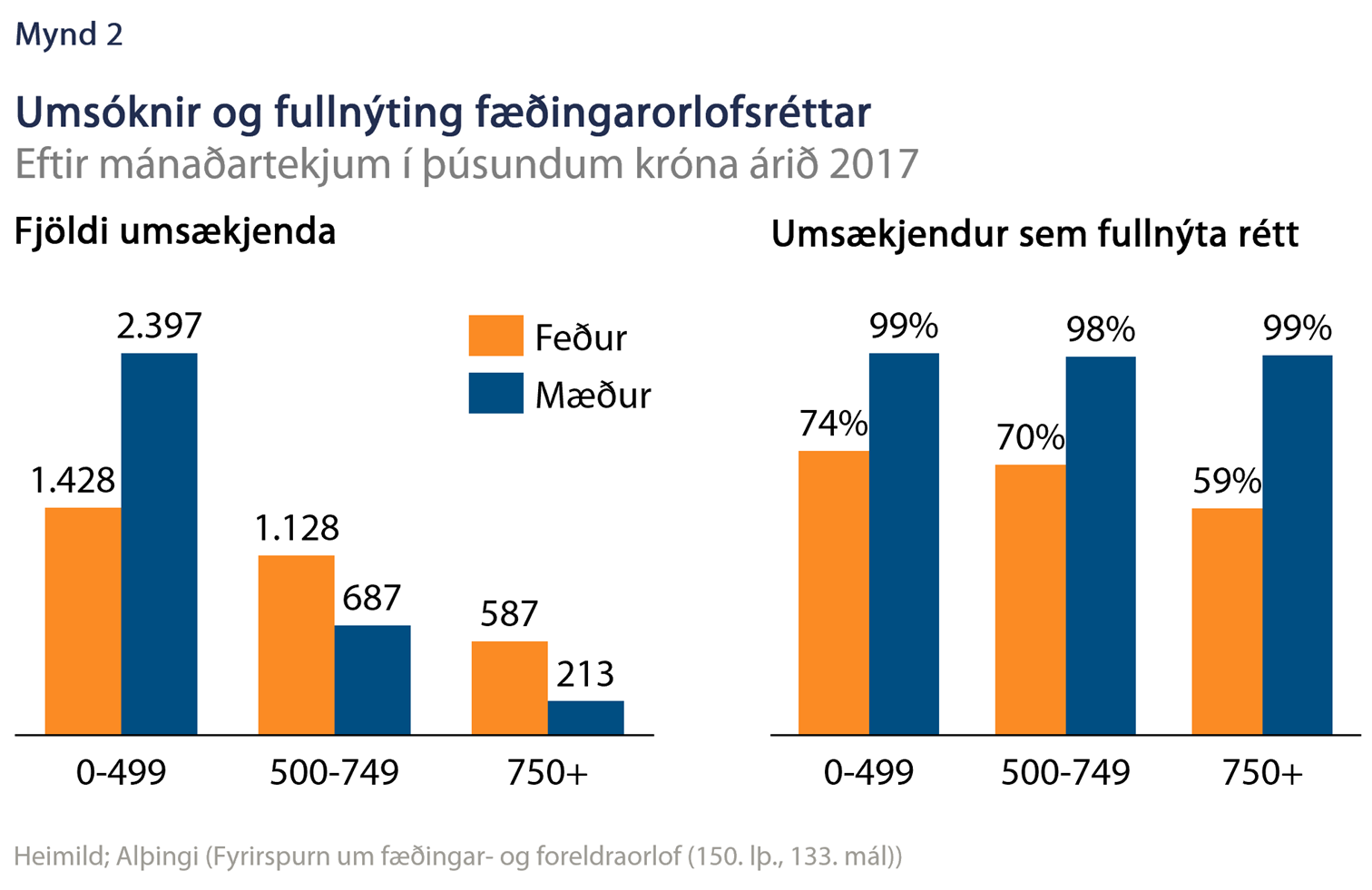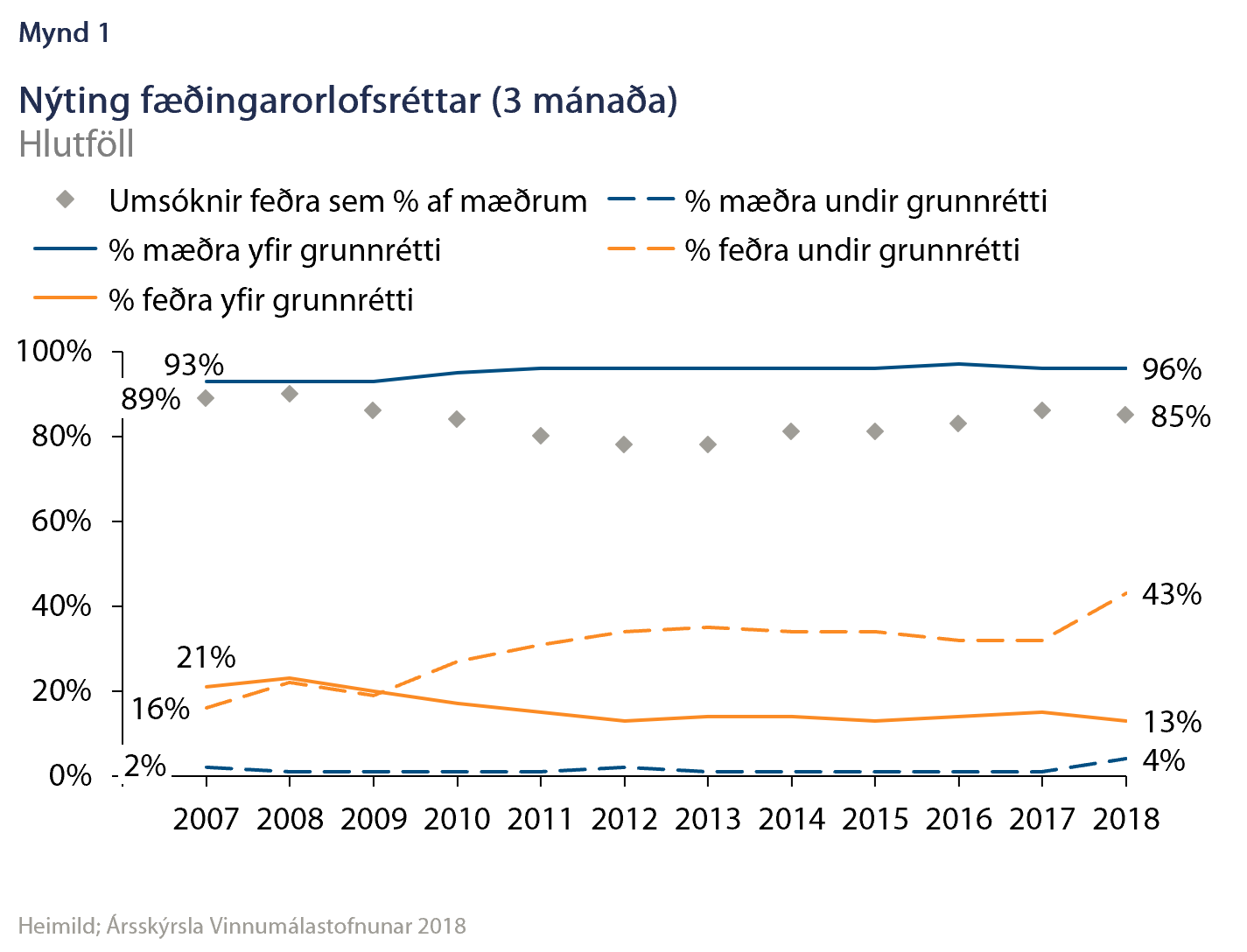 Eftir að mánaðarlegar hámarksgreiðslur úr Fæðingarorlofssjóði voru skertar um 44% frá 2007 til 2008 dró úr nýtingu feðra á fæðingarorlofi.1 Í kjölfarið fór hlutfall feðra sem fullnýttu ekki grunnréttinn sinn (3 mánuðir) vaxandi frá 2009. Árið 2018 var hlutfall feðra sem fullnýttu grunnrétt sinn 43% en hlutfall mæðra 96%. Ef tekið er tillit til þess að umsóknir feðra í sjóðinn sem hlutfall af mæðrum var 85% nýttu 51% feðra ekki grunnrétt sinn. Í ofanálag taka einungis 13% feðra fæðingarorlof lengur en 3 mánuði. Ekki fæst séð að lenging grunnréttar foreldra sé endilega til þess fallin að auka nýtingu orlofs í mörgum tilfellum og telja má afar líklegt að fjöldi feðra sem ekki nýtir sinn grunnrétt fari vaxandi.