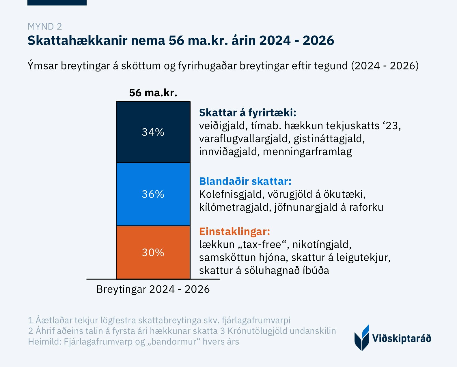 Í samhengi við fyrirhugaðar skattahækkanir næsta árs er mikilvægt að líta til fyrri ára en skattahækkanir árin 2024 - 2026 nema 56 ma. kr. Það eru áætluð áhrif af helstu lögfestu skattabreytingum skv. fjárlagafrumvarpi hvers árs, að krónutölugjöldum undanskildum. Af þessum sköttum falla 34% beint á fyrirtæki, 30% á einstaklinga og 36% á hvort tveggja einstaklinga og fyrirtæki.