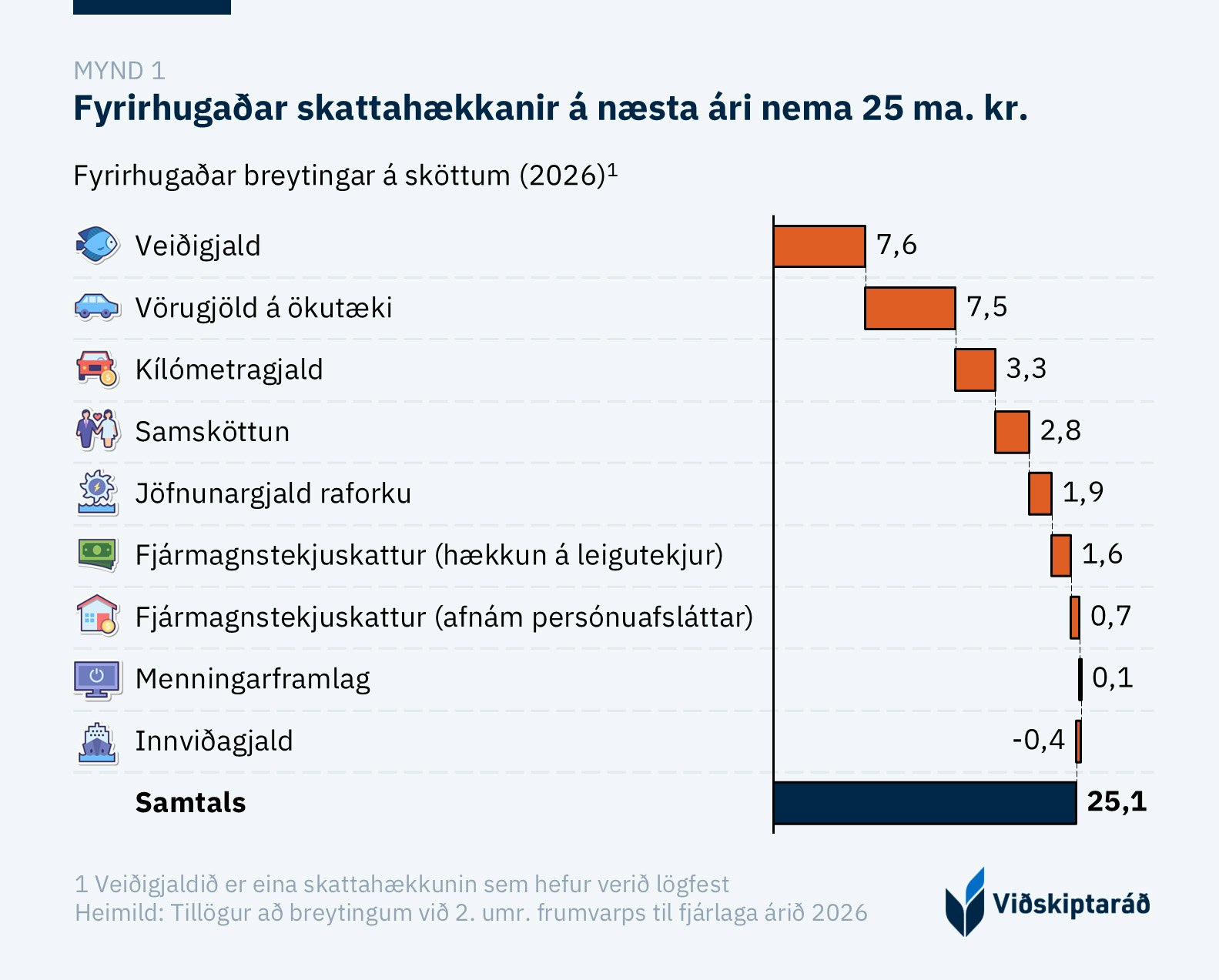Fyrirhugaðar skattahækkanir á næsta ári nema 25 ma. kr. miðað við forsendur fjárlagafrumvarps eftir 2. umræðu (mynd 1). Umfangsmestu hækkanirnar eru veiðigjald, vörugjöld á ökutæki, kílómetragjald og afnám samsköttunar hjóna. Við þessi atriði má svo bæta ýmsum öðrum skattahækkunum sem frumvarpið felur í sér en um þau atriði er nánar fjallað síðar í umsögninni. Á hinn bóginn áforma stjórnvöld að draga úr innviðagjaldi.