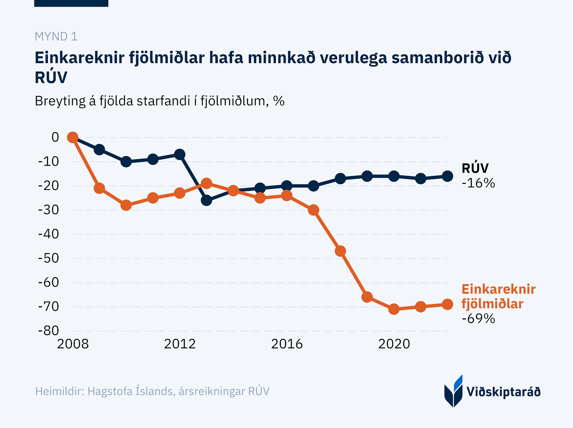 Rekstur einkareknu miðlanna hefur enda verið þungur undanfarið sem endurspeglast m.a. í því að starfandi á einkareknum fjölmiðlum hefur á undanförnum fimmtán árum fækkað um 69%, á meðan að fækkunin var 16% hjá RÚV á sama tímabili (mynd 1).