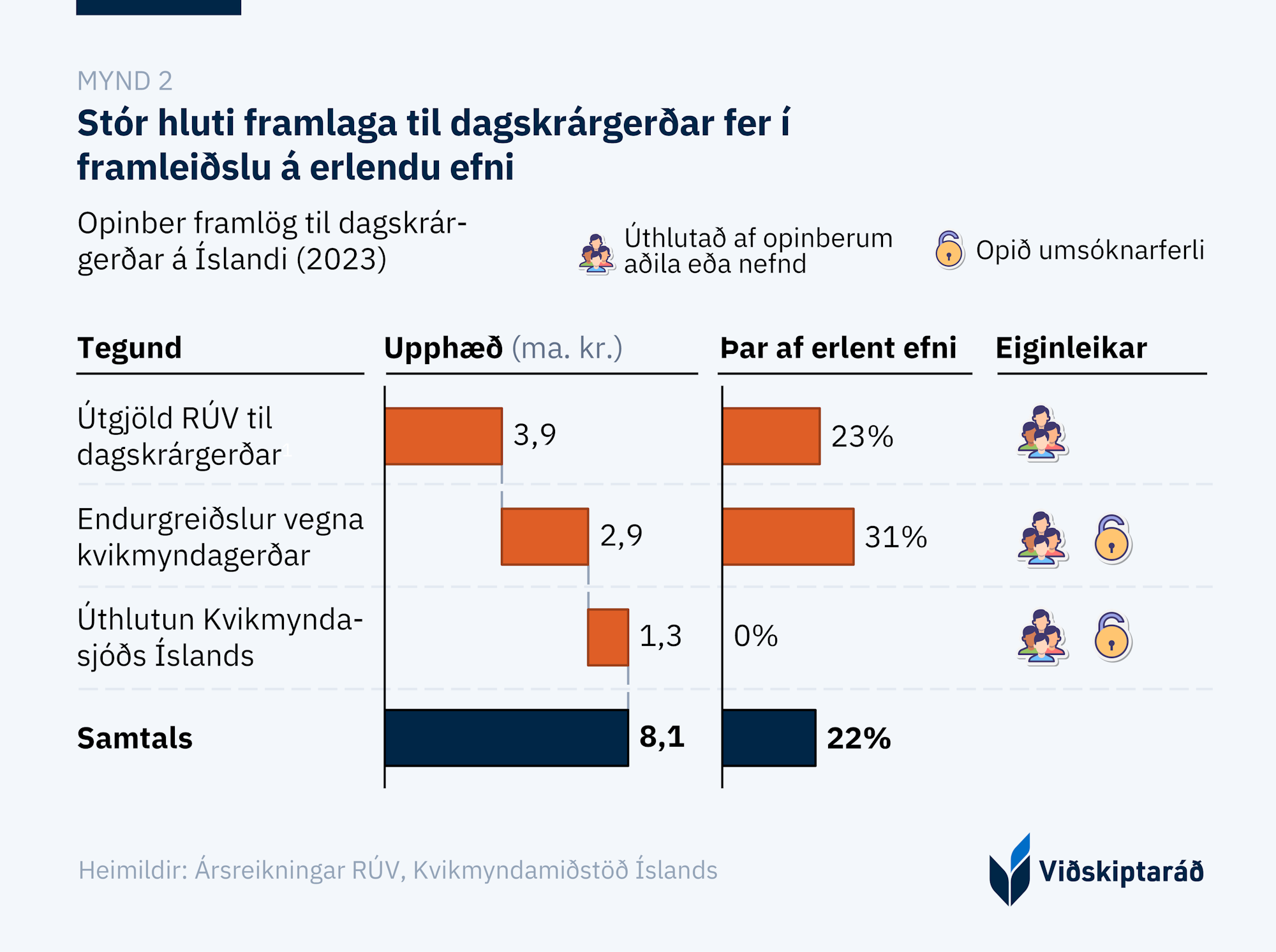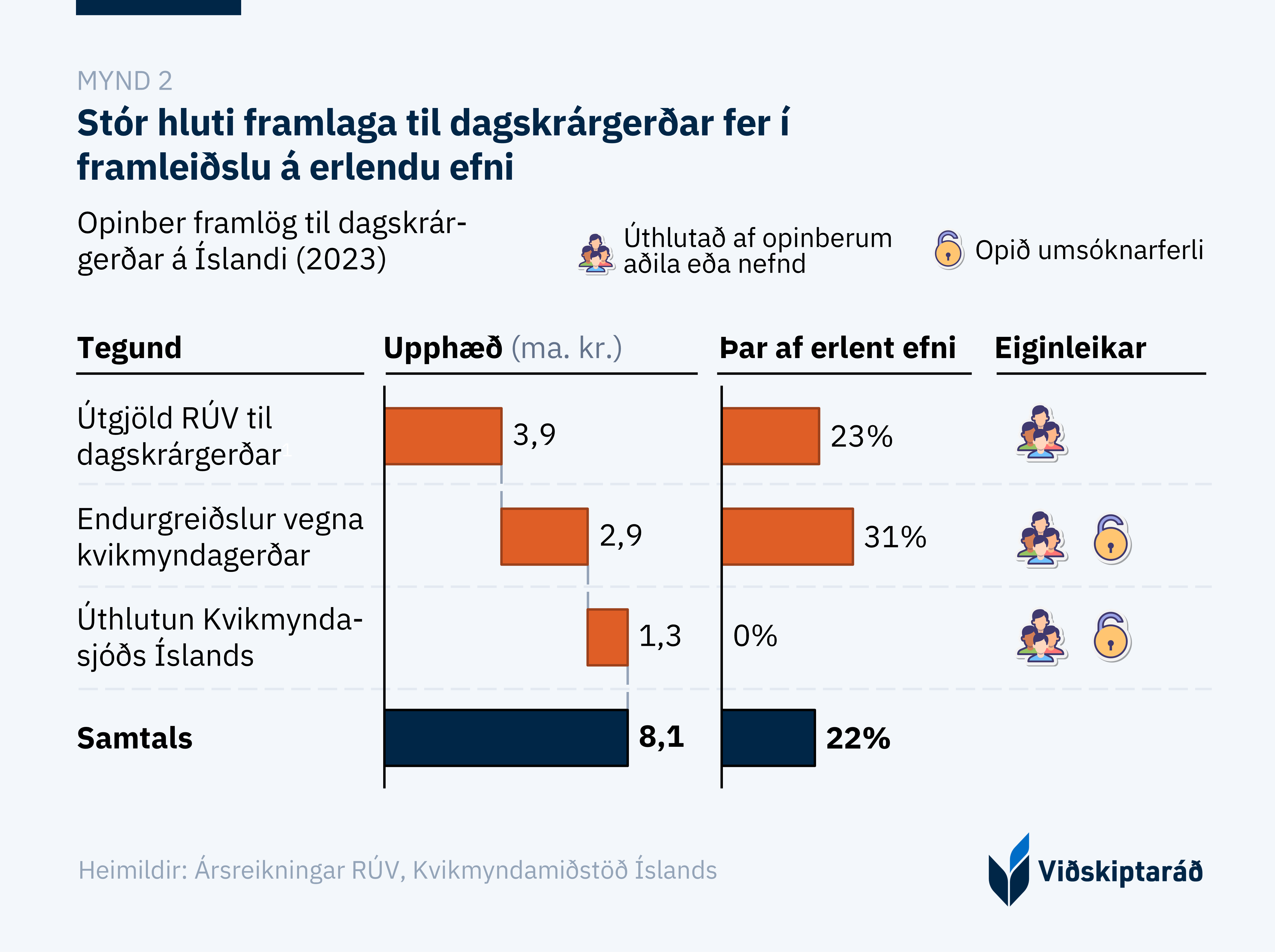 Árið 2023 varði ríkissjóður beint eða óbeint 8,1 ma.kr. til framleiðslu eða kaupa á dagskrárgerðarefni. Framlögin voru veitt með þrennum hætti: til eða í gegnum framleiðslu og kaup Ríkisútvarpsins, með endurgreiðslum vegna framleiðslukostnaðar kvikmynda eða sjónvarpsefnis, og í gegnum Kvikmyndasjóð Íslands. 22% af þessum útgjöldum runnu til kaupa eða framleiðslu á erlendu efni.