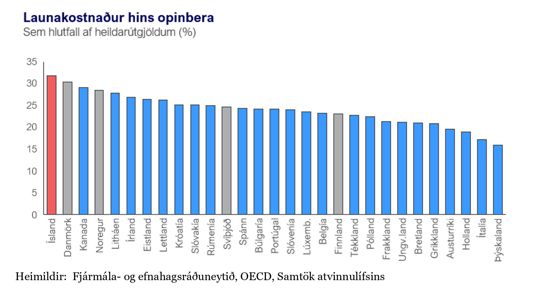 Launakostnaður hins opinbera sem hlutfall af heildarútgjöldum er nú hvergi hærri en á Íslandi, innan OECD. Þegar launaþróun er úr samræmi við efnahagslegan stöðugleika er erfitt að halda aftur af ósjálfbærum útgjaldavexti ríkissjóðs. Til að tryggja það jafnvægi í efnahagslífinu sem reglunni er ætlað að stuðla að, sem og ríkisfjármálum, þurfa yfirvöld að stuðla að skynsamlegri umgjörð vinnumarkaðar og skilvirkri kjarasamningagerð. Jafnframt þarf að tryggja að opinberi markaðurinn fylgi þeirri launastefnu sem almenni markaðurinn setur hverju sinni. Þá þarf að tryggja að launaþróun starfsmanna ríkisins sé innan fjárheimilda en vísbendingar eru um að svo sé ekki. Ótækt er ef eina meðalið við ósjálfbærri launaþróun hjá ríkinu eru skattahækkanir, fremur en bætt umgjörð vinnumarkaðar og betri eftirfylgni með launasetningu ríkisstarfsmanna.