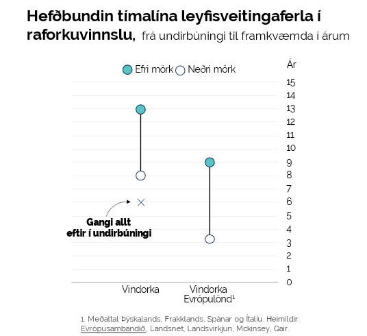 Tafir í rammaáætlun og leyfisveitingaferli rýra samkeppnishæfni endurnýjanlegrar orku en fjölmörg tækifæri eru til að ná aukinni skilvirkni án þess að bitni á kröfum um gæði, né rétti almennings og hagsmunaaðila til samráðs. Sameining afgreiðslu leyfisveitinga frá upphafi til endis í einn samfelldan úrvinnsluferil myndi auk þess lágmarka margföldunaráhrif kæruferla og gagnaskila. Þá hafa lögbundnir frestir verið virtir að vettugi og afgreiðsla mála farið langt umfram tímamörk. Því væri eitt einfalt skref til úrbóta að einfaldlega virða sett tímamörk.