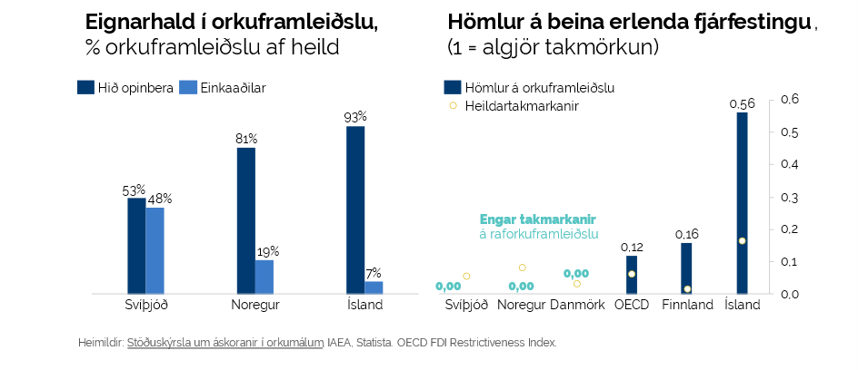 Á Íslandi er eignarhald hins opinbera í orkuframleiðslufyrirtækjum meira en gengur og gerist hjá nágrannalöndum okkar, sem skekkir ekki aðeins samkeppnisstöðu á markaðnum, heldur hamlar aðgengi nýrra aðila inn á markaðinn. Þriðju orkuskiptin eru framundan og því brýnt að kraftar einkaframtaksins séu virkjaðir til þátttöku. Ávinningurinn er margvíslegur en þannig má m.a. ná fram aukinni fjölbreytni í fyrirkomulagi framkvæmda, áhættudreifingu og skilvirkni.