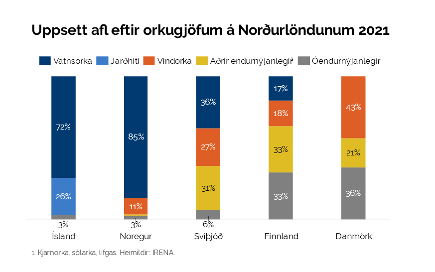 Á Norðurlöndunum er raforkuvinnsla sjálfbærra orkugjafa fjölbreyttari en á Íslandi. Hingað til höfum við stólað á fallvatnsorku og jarðhita til raforkuframleiðslu. Tímabært er að við lítum til fjölbreyttari kosta, svo sem vindorku. Rannsóknir sýna að aðstæður til nýtingar vindorku eru hagstæðar á Íslandi og fellur orkuöflun vindmylla vel að notkun vatnsafls. Þannig getur fjölbreytni í orkuöflun stuðlað að auknu orkuöryggi og aukið líkurnar á því að við stöndum við alþjóðlegar skuldbindingar í loftslagsmálum.