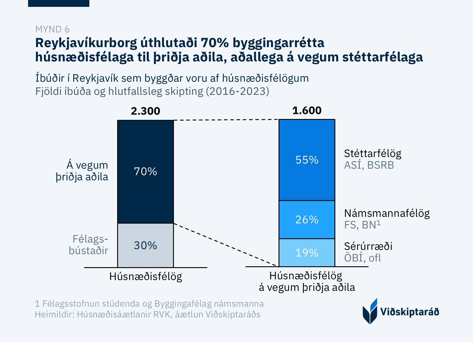 Útfærsla stjórnvalda í Reykjavíkurborg á þessari stefnu þýðir að einungis 55% nýbygginga fer á almennan húsnæðismarkað. Hinum 45% verður ráðstafað í niðurgreidd úrræði utan almenna húsnæðismarkaðarins. Þar vega þyngst húsnæðisfélög en þau ráðstafa niðurgreiddum leiguíbúðum á grundvelli tekju- og eignaviðmiða. Tveir þriðju þessara húsnæðisfélaga eru á vegum þriðju aðila og til að fá þeirra íbúðum úthlutað er ekki nóg að uppfylla fyrrgreind skilyrði, heldur standa íbúðir þeirra einungis þeirra félagsmönnum til boða.