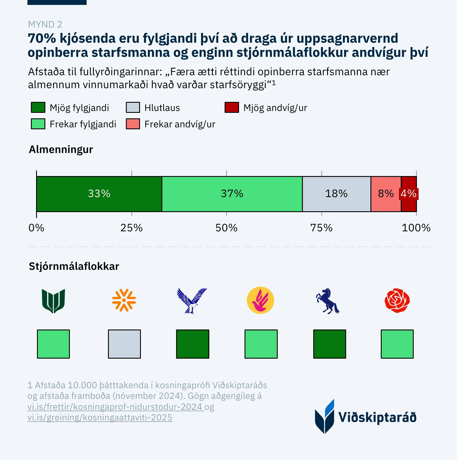 Í kosningaprófi sem Viðskiptaráð lagði fyrir almenning voru 70% þátttakenda fylgjandi því að færa réttindi opinberra starfsmanna nær því sem gerist á almennum vinnumarkaði þegar kemur að starfsöryggi (mynd 2). Þá var enginn flokkur á Alþingi andsnúin breytingunni. Þannig nýtur minni uppsagnarvernd afgerandi stuðnings bæði meðal kjósenda og stjórnmálaflokka.