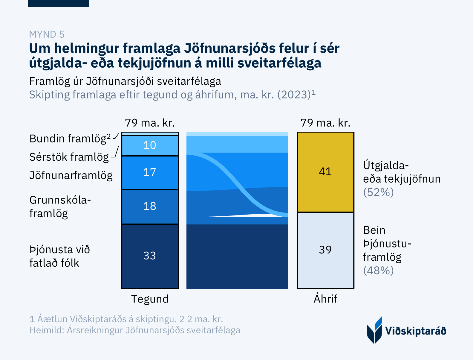 Um helmingur útgjalda sjóðsins felur í sér bein framlög vegna þjónustu við íbúa (mynd 5). Hinn helmingurinn felur í sér útgjalda- eða tekjujöfnun á milli sveitarfélaga. Í útgjalda- og tekjujöfnun felst að taka skattfé frá sveitarfélögum sem eru hagkvæmari í rekstri og færa til þeirra sem eru verr rekin.