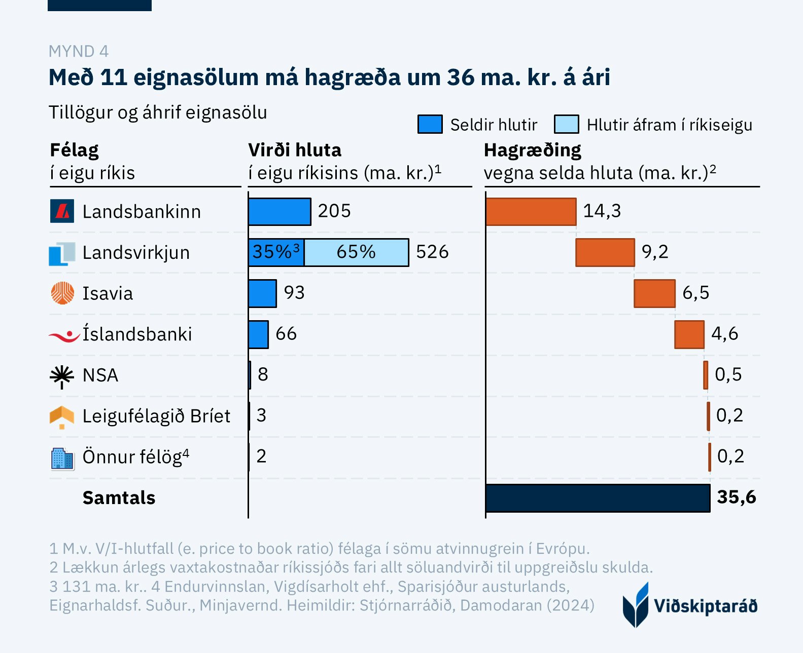 Viðskiptaráð leggur til að hlutur ríkisins í 11 félögum að andvirði 508 ma. kr. verði seldur (mynd 4). Þessi aðgerð myndi skila miklu fjármagni til ríkisins, sem nota mætti til að greiða skuldir. Tillögurnar myndu skila 36 ma. kr. hagræði árlega í form lægri vaxtakostnaðar.