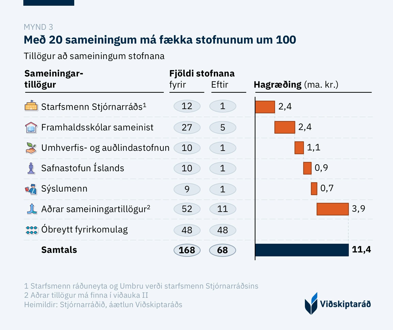 Viðskiptaráð hvetur stjórnvöld til að gera tölusetta kröfu um hagræðingu sem sameiningar eiga að leiða af sér. Með slíkum kröfum er hægt að tryggja að hagræðingaraðgerðir leiði til lækkunar á rekstrarkostnaði sameinaðrar stofnunar. Í þessu samhengi hvetur Viðskiptaráð stjórnvöld til að íhuga fleiri sameiningar en þær sem eru nefndar í áætluninni og takmarka sig ekki við stofnanir sem hafa færri en 50 starfsmenn. Viðskiptaráð hefur mótað 20 tillögur sem sem myndu fækka stofnunum um 100, úr 168 í 68 (mynd 3). Nánar má lesa um tillögurnar í umsögn Viðskiptaráðs um áætlun stjórnvalda um hagræði í ríkisrekstri. [7]