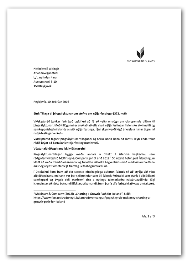 Viðskiptaráð hefur skilað umsögn vegna þingsályktunartillögu um stefnu um nýfjárfestingar. Viðskiptaráð fagnar tillögunni og tekur undir hana að mestu leyti enda telur ráðið brýnt að bæta innlent fjárfestingarumhverfi. Lagði ráðið m.a. fram tillögur til aðgerða sem það telur vera til þess fallnar að …