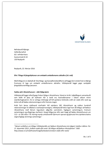 Viðskiptaráð hefur skilað inn umsögn vegna þingsályktunartillögu um embætti umboðsmanns aldraðra. Viðskiptaráð leggst gegn frekari fjölgun ríkisstofnana og telur að frekar ætti að fækka þeim. Ennfremur telur ráðið óeðlilegt að stjórnvöld sinni hagsmunagæslu fyrir afmarkaða þjóðfélagshópa líkt og …