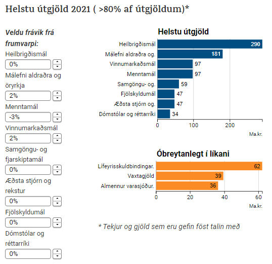 Grunnsviðsmyndin er fjárlagafrumvarp ársins 2021 með breytingartillögum meirihluta fjárlaganefndar sem juku útgjöld um 56 milljarða króna. Til að stilla upp þínum fjárlögum hnikar þú til helstu útgjalda- og tekjuliðum eftir því hversu mikið frávikið skal vera frá grunnsviðsmyndinni.
