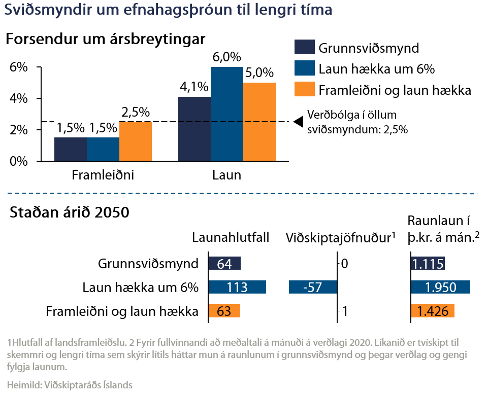Dæmið að framan myndi augljóslega ekki ganga upp, eins og reynslan sýnir. Til að ná aftur einhverju eðlilegu og sjálfbæru jafnvægi myndi verðbólga þurfa að aukast og gengið að gefa eftir í samræmi við laun. Niðurstaðan þá væri mjög svipuð og í grunnsviðsmynd en á kostnað verðbólgu.
