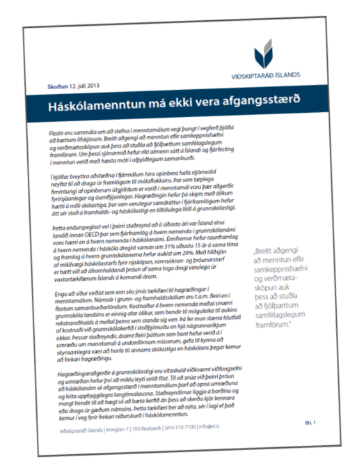 Flestir eru sammála um að stefna í menntamálum vegi þungt í vegferð þjóða að bættum lífskjörum. Breitt aðgengi að menntun eflir samkeppnishæfni og verðmætasköpun auk þess að stuðla að fjölþættum samfélagslegum framförum. Um þessi sjónarmið hefur ríkt almenn sátt á Íslandi og fjárfesting í menntun …