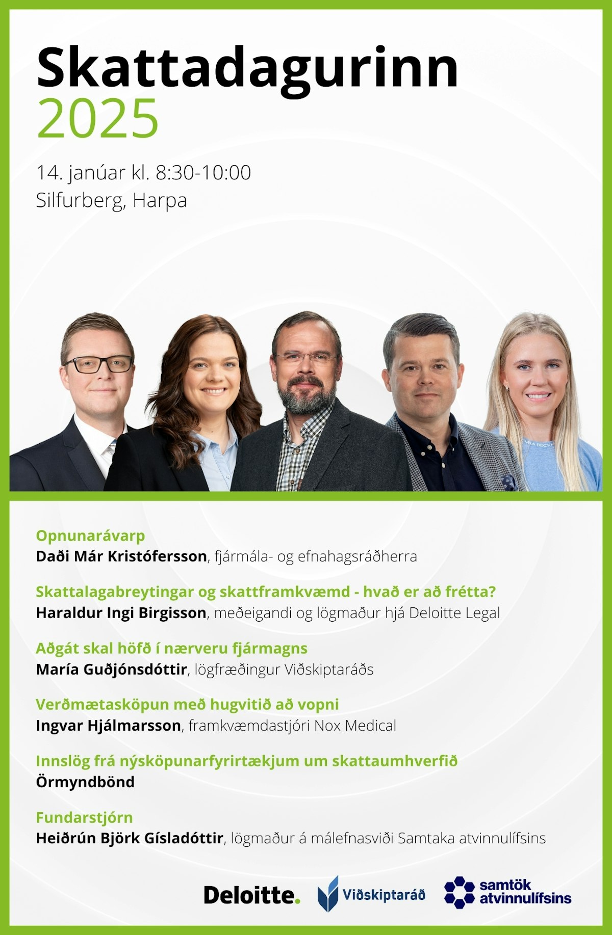 Hinn árlegi Skattadagur Deloitte, Viðskiptaráðs og Samtaka atvinnulífsins verður haldinn 14. janúar kl. 8:30-10:00 í Silfurbergi, Hörpu.