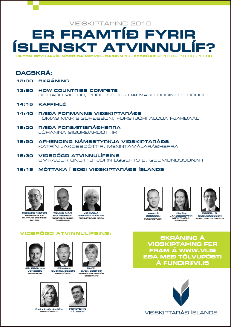 Aðalræðumaður þingsins í ár er Dr. Richard Vietor prófessor við Harvard Business School og mun hann í erindi sínum fjalla um uppbyggingu efnahagsáætlana sem miða að samkeppnishæfni þjóða. Dr. Vietor kennir alþjóða stjórnmála- og hagfræði, en hann skrifaði bókina How Countries Compete: Strategy, Structure and Government in the Global Economy og hefur einnig stundað viðamiklar rannsóknir og ráðgjöf á sviði stefnumótunar stjórnvalda og viðskiptalífs. Hér má nálgast nánari upplýsingar um Dr. Vietor og hér má nálgast upplýsingar um fyrrnefnda bók.