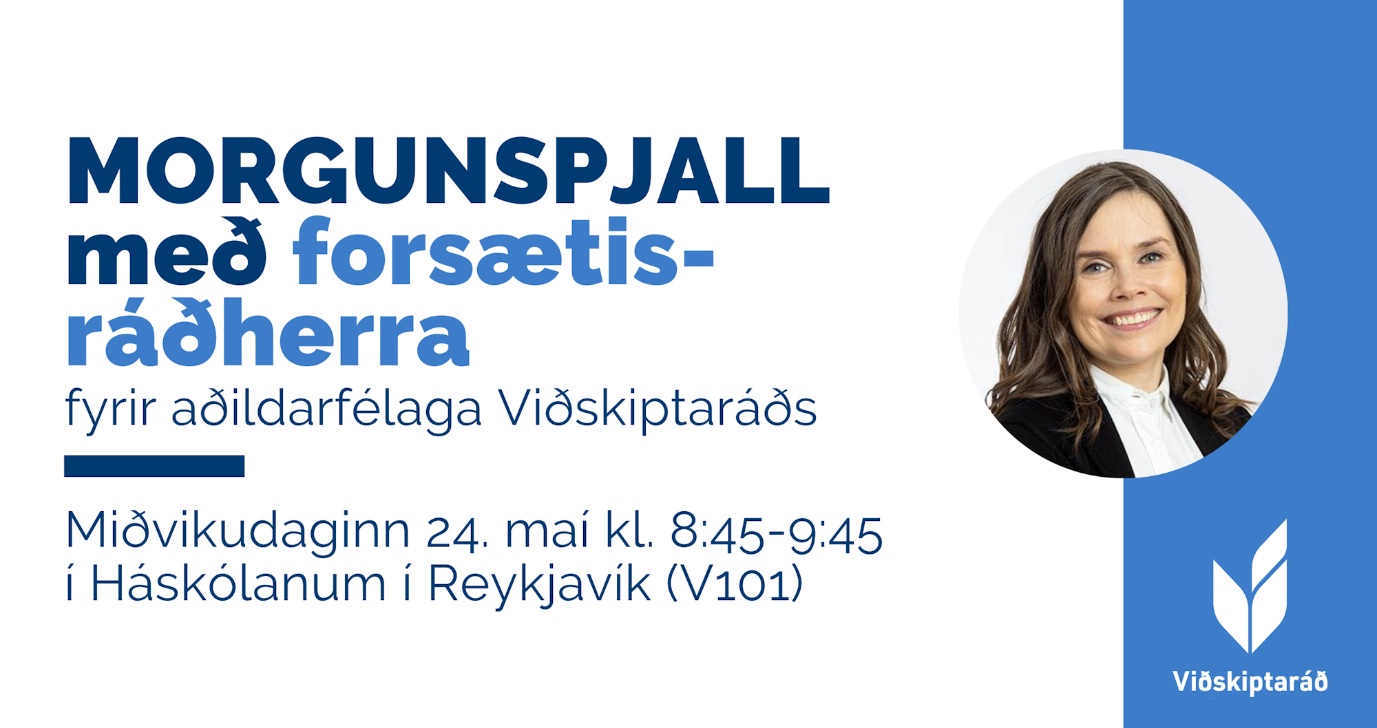 Morgunspjall með forsætisráðherra, Katrínu Jakobsdóttur, miðvikudaginn 24. maí kl. 8:45-9:45 í Háskólanum í Reykjavík (V101). Fundurinn er aðeins opinn aðildarfélögum Viðskiptaráðs. Katrín hefur verið á fundaferð um landið til að ræða grænbók sína um sjálfbært Ísland. Hún mun ræða þau mál og önnur sem brenna á félögum Viðskiptaráðs.