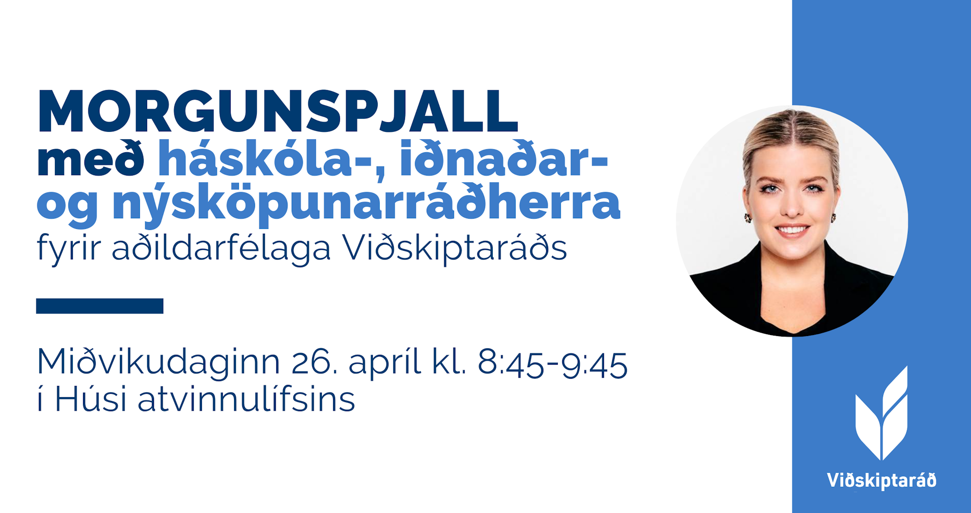 Morgunspjalli með háskóla-, iðnaðar- og nýsköpunarráðherra miðvikudagsmorguninn 26. apríl kl. 8:45. Heitt á könnunni frá kl. 8:30. Fundurinn er aðeins opinn aðildarfélögum Viðskiptaráðs.
