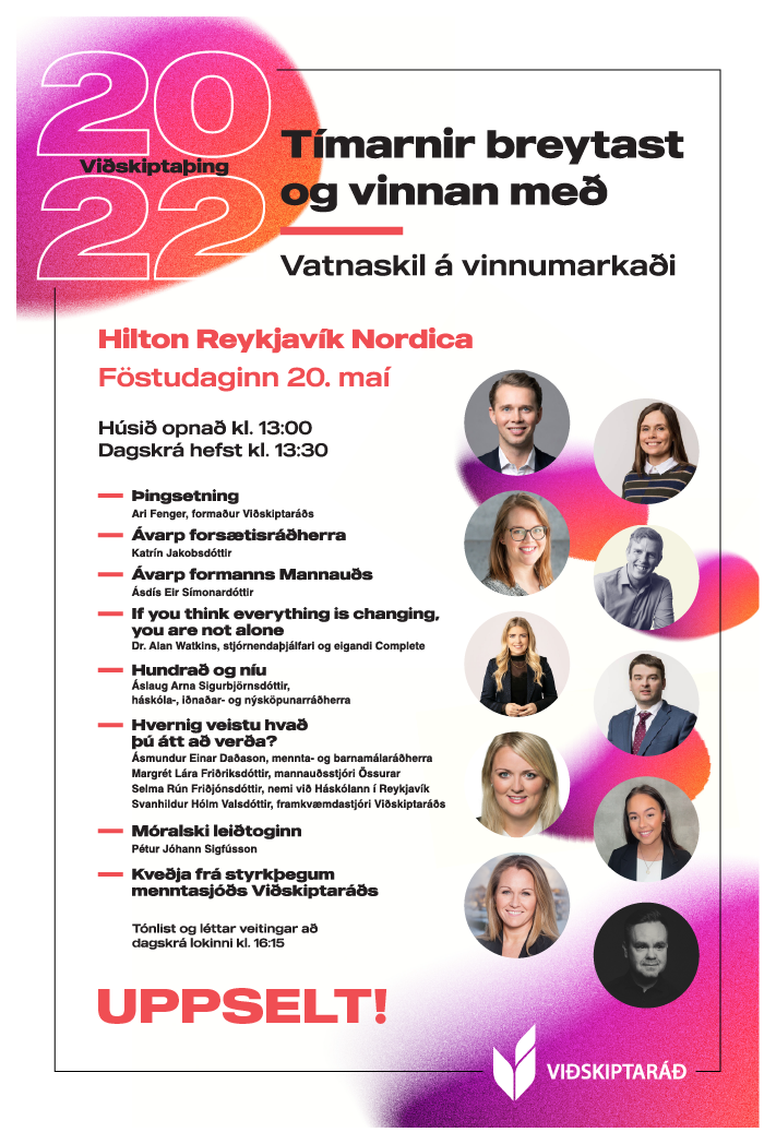 Á Viðskiptaþingi ársins verður sjónum beint að vinnumarkaðnum, vinnustöðum og þeim miklu breytingum sem virðast vera að eiga sér stað. Þessi áhersla er ekki úr lausu lofti gripin en kannanir McKinsey og fleiri benda til þess að mun fleiri hugsi sér til hreyfings en áður hefur sést, hvort sem litið er til Evrópu eða Bandaríkjanna. Á sama tíma telja yfir 40% stjórnenda í 400 stærstu fyrirtækjum hér á landi að skortur verði á vinnuafli á næstunni. Allt þetta og meira til felur í sér ýmsar áskoranir en um leið fjölmörg tækifæri sé vel haldið á spöðunum.