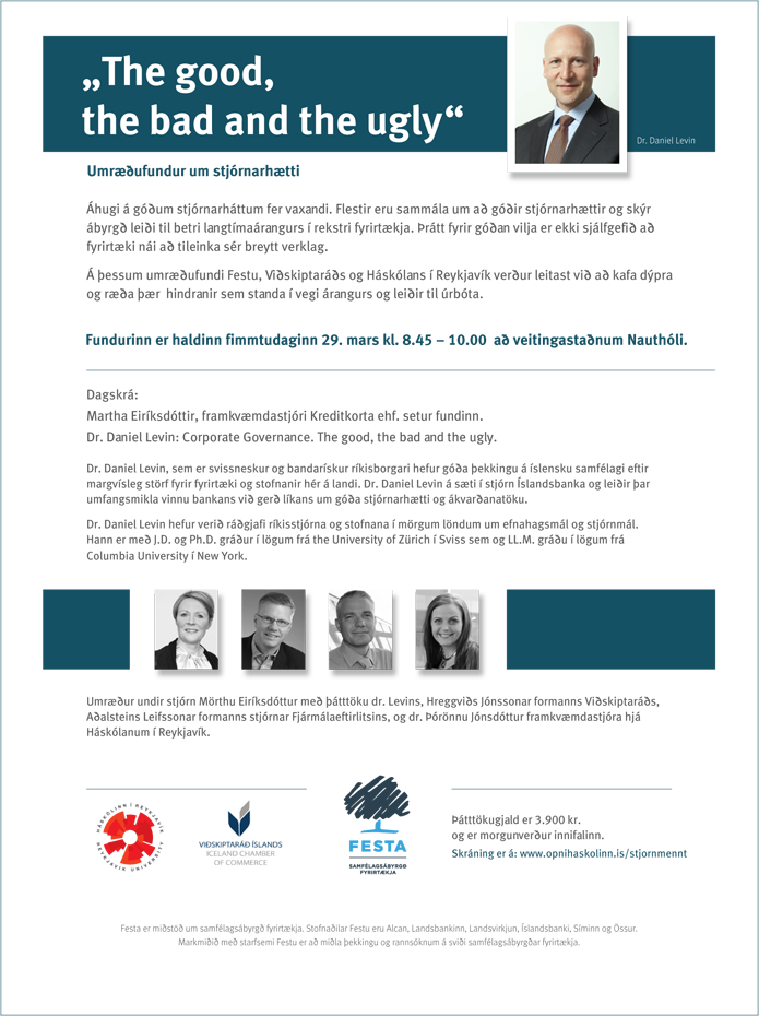 Áhugi á góðum stjórnarháttum hefur farið vaxandi síðustu misseri. Þrátt fyrir að flestir séu sammála um að góðir stjórnarhættir og skýr ábyrgð leiði til betri langtímaárangurs er ekki sjálfgefið að fyrirtæki nái að tileinka sér breytt verklag. Á þessum umræðufundi verður kafað dýpra og svara leitað …