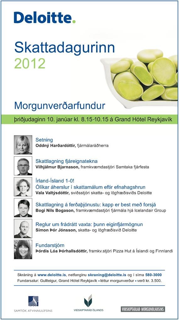 Skattadagur Deloitte, í samstarfi við Viðskiptaráð Íslands, Samtök atvinnulífsins og Viðskiptablað Morgunblaðsins, verður haldinn að Grand Hótel Reykjavík þriðjudaginn 10. janúar 2012. Fundurinn stendur frá klukkan 8:15 til 10:15, en nýskipaður fjármálaráðherra, Oddný Harðardóttir, mun setja fundinn.
