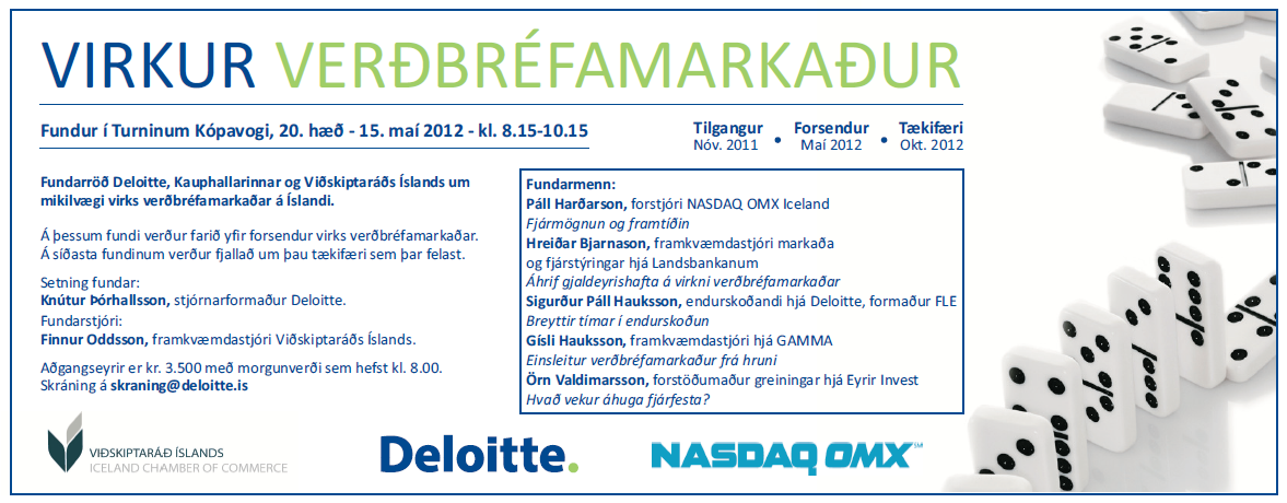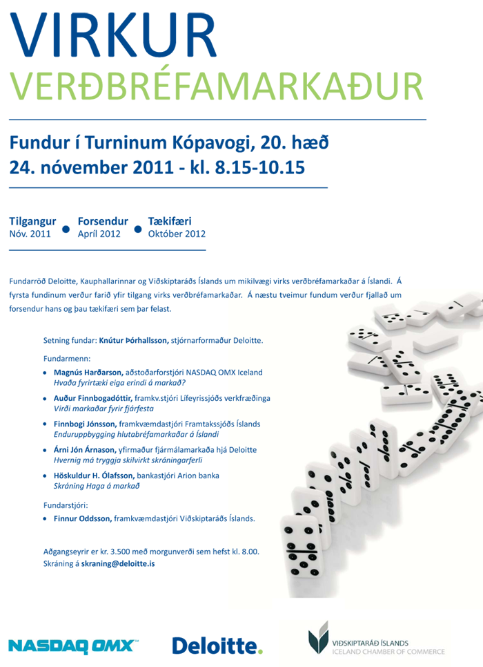 Fundarröð Deloitte, Kauphallarinnar og Viðskiptaráðs Íslands um mikilvægi virks verðbréfamarkaðar á Íslandi. Á fyrsta fundinum verður farið yfir tilgang virks verðbréfamarkaðar. Á næstu tveimur fundum verður fjallað um forsendur hans og þau tækifæri sem þar felast.