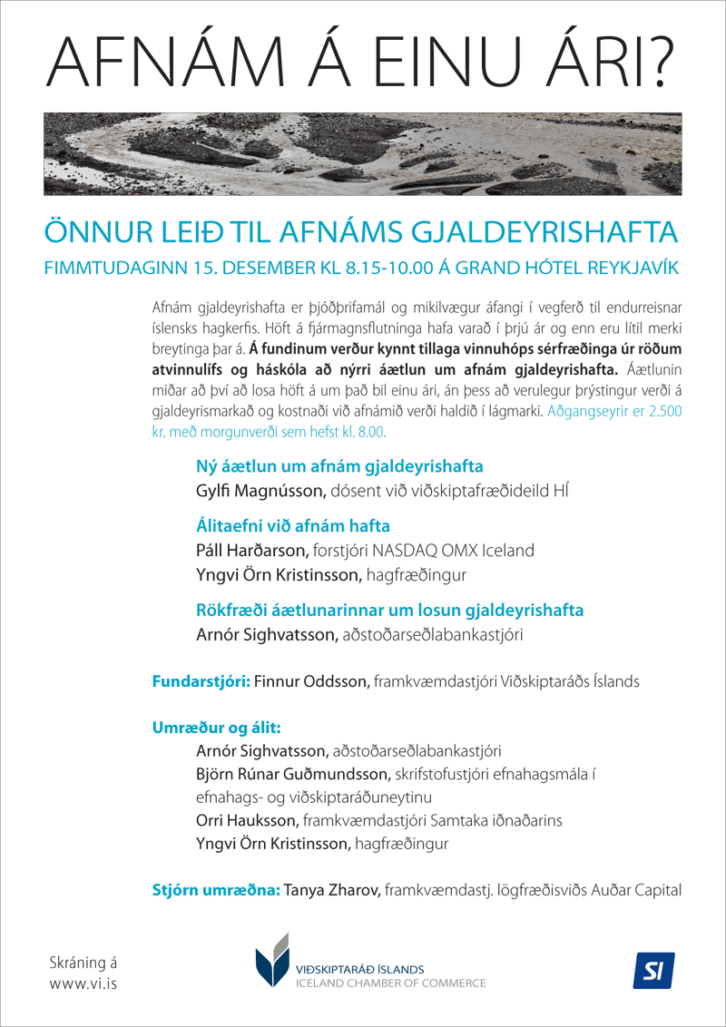Afnám gjaldeyrishafta er þjóðþrifamál og mikilvægur áfangi í vegferð til endurreisnar íslensks hagkerfis. Höft á fjármagnsflutninga hafa varað í þrjú ár og enn eru lítil merki breytinga þar á. Á fundinum verður kynnt tillaga vinnuhóps sérfræðinga úr röðum atvinnulífs og háskóla að nýrri áætlun um …