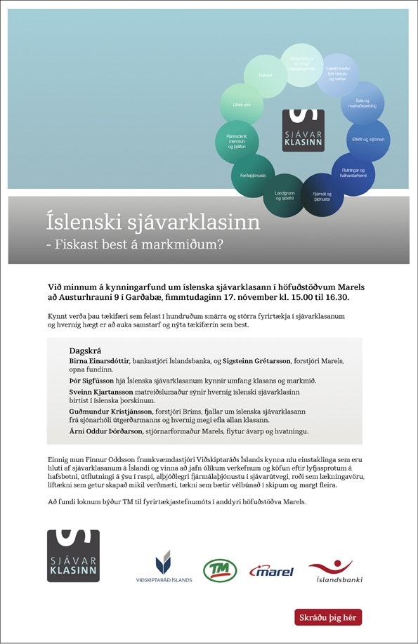 Þér er boðið á kynningarfund um íslenska sjávarklasann í höfuðstöðvum Marels að Austurhrauni 9 í Garðabæ, fimmtudaginn 17. nóvember kl. 15.00 til 16.30. Kynnt verða þau tækifæri sem felast í hundruðum smárra og stórra fyrirtækja í sjávarklasanum og hvernig hægt er að auka samstarf og nýta tækifærin …