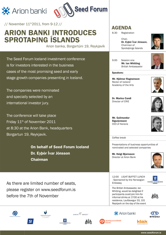 Seed Forum Iceland ráðstefnan verður haldin í höfuðstöðvum Arion banka í Borgartúni, föstudaginn 13. apríl næstkomandi kl. 8:30. Hr. Ólafur Ragnar Grímsson setur ráðstefnuna og fyrirlesarar verða Joachim Krohn-Hoegh framkvæmdastjóri Argentum, Svana Björnsdóttir formaður Samtaka iðnaðarins, Torkel …