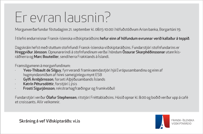 Í tilefni endurreisnar Fransk-íslenska viðskiptaráðsins, hefur einn af höfundum evrunnar verið kallaður á teppið. Ráðið býður til morgunverðarfundar í húsakynnum Arion banka, Borgartúni, föstudaginn 21. september kl. 08:15-10:00. Dagskráin hefst með stuttum stofnfundi Fransk-íslenska viðskiptaráðsins.
