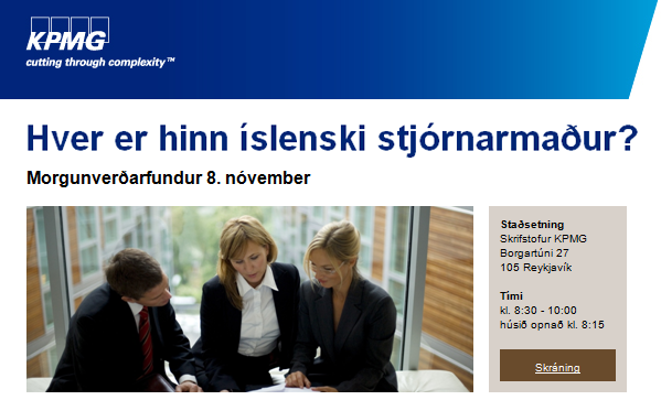 KPMG og Viðskiptaráð Íslands standa fyrir morgunverðarfundi þriðjudaginn 8. nóvember kl. 8:30 - 10. Fundurinn fer fram í húsakynnum KPMG í Borgartúni 27 og verða þar kynntar helstu niðurstöður könnunar sem KPMG framkvæmdi í sumar meðal íslenskra stjórnarmanna til að kanna bakgrunn þeirra og störf …