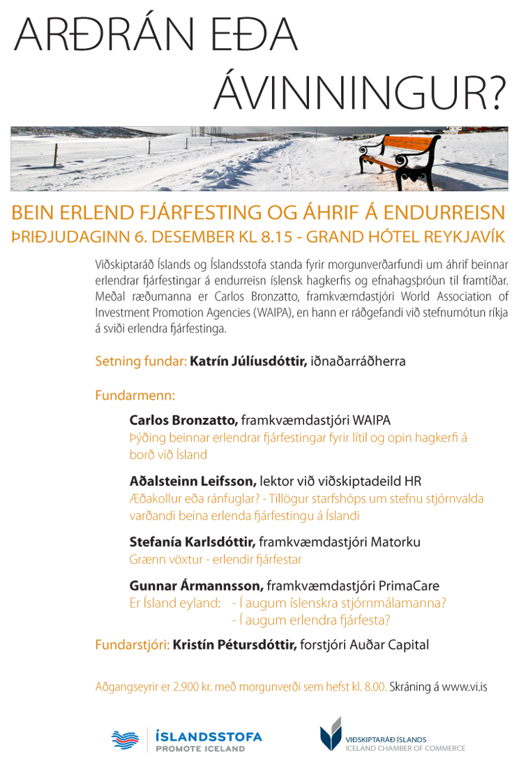 Viðskiptaráð Íslands og Íslandsstofa standa fyrir morgunverðarfundi um áhrif beinnar erlendrar fjárfestingar á endurreisn íslensks hagkerfis og efnahagsþróun til framtíðar. Meðal ræðumanna er Carlos Bronzatto, framkvæmdastjóri World Association of Investment Promotion Agencies (WAIPA), en hann er …